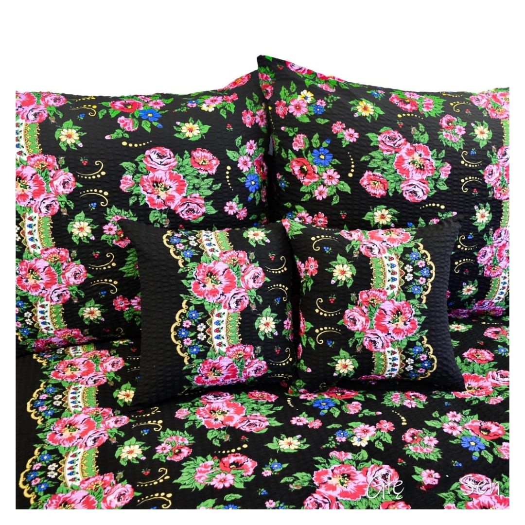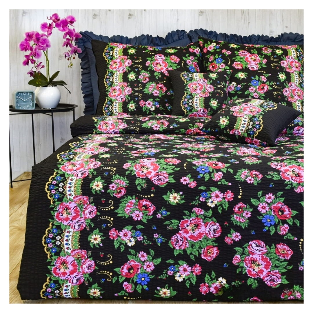 Komplet pościeli z kory Halka Góralka Czarna 140x200. Pościel góralska o bardzo bogatym i kolorowym wzornictwie. Czarne tło materiału jest ozdobione intensywnymi, dużymi różami oraz mniejszymi kwiatami w odcieniach różu, czerwieni, zieleni i niebieskiego. Wzór kwiatowy jest dodatkowo podkreślony zdobieniami w postaci łuków i małych ornamentów, które przypominają tradycyjne, ludowe motywy. Całość tworzy harmonijny i relaksujący wzór, który jest zarówno ozdobny, jak i subtelny.
