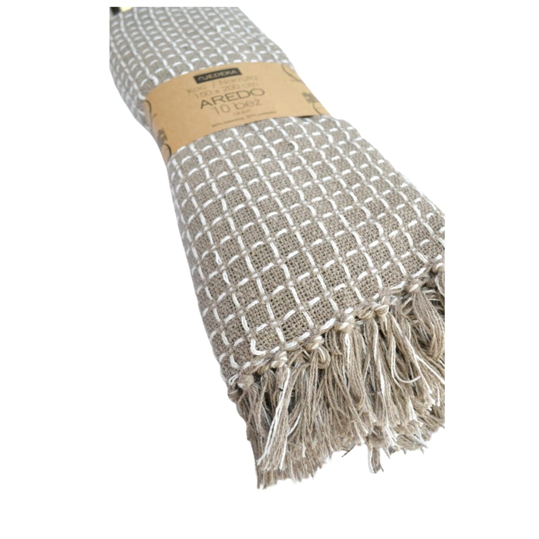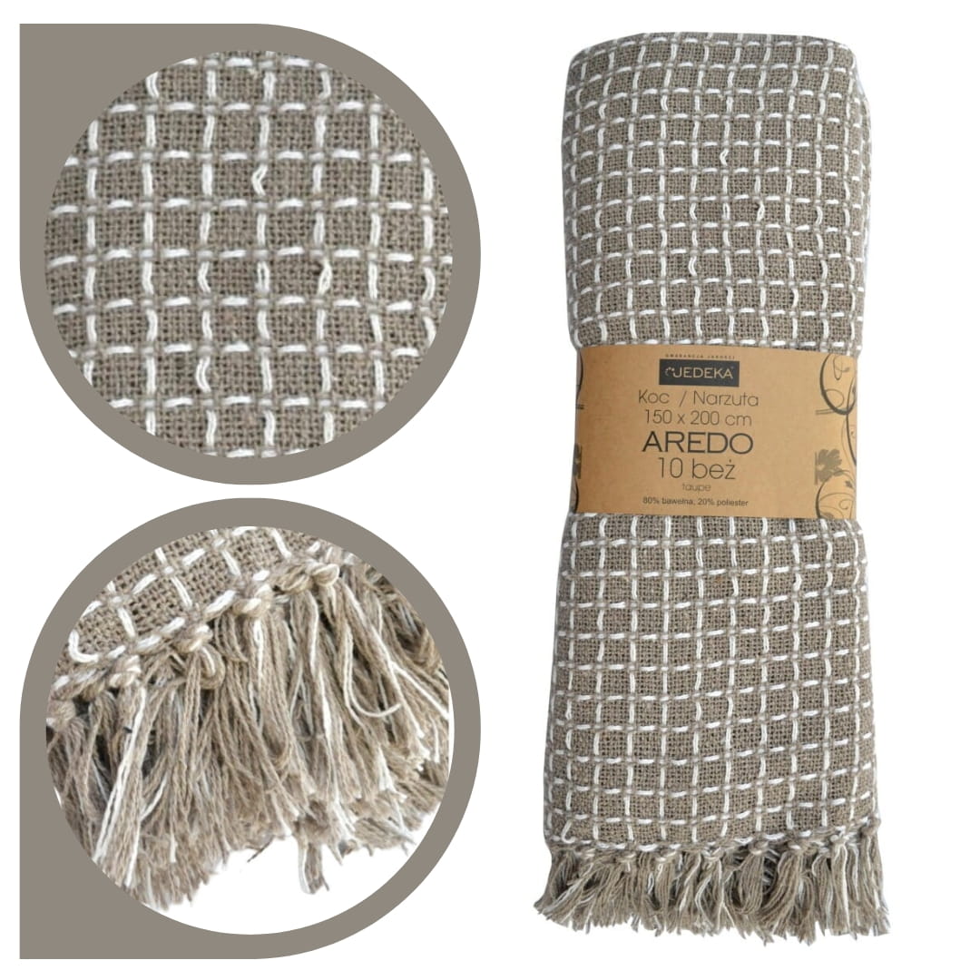 Bawełniany koc / narzuta Aredo z kolekcji marki JEDEKA. Wykonany z wysokiej jakości, miękkiej bawełny, zapewnia niezrównany komfort i delikatność w dotyku. Wykonana jest z 80% bawełny i 20% polisetru, dzięki czemu nie krępuje ruchów podczas użytkowania. Jest zarówno praktycznyjaki i estetyczny. Idealnie ozdobi Twoje wnętrze a także można go wykorzystać na pikniki i inne rodzinne wyjazdy. Produkt świetnie spełnia zadania przytulnego i ciepłego koca oraz narzuty na łóżko. Wykończony i ozdobiony frędzlami które nadają lekkości i charakterystycznej nonszalancji stylu boho.