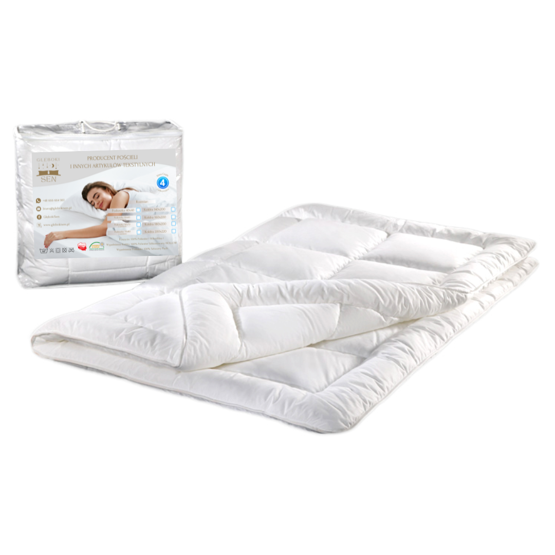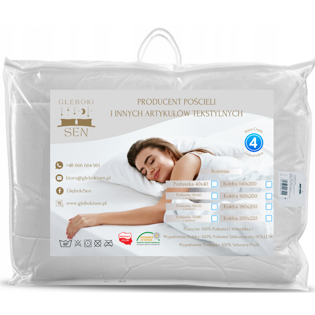 Kołdra antyalergiczna całoroczna medyczna marki Głęboki Sen. Kolekcja Głęboki Sen to produkty doskonale spełniające najwyższe wymagania jakościowe i użytkowe. Pranie w wysokich temperaturach eliminuje szkodliwe dla człowieka drobnoustroje, dlatego kolekcja jest idealna dla osób ze skłonnościami alergicznymi. Kołdra wypełniona jest płatem włóknianym sylikonowym typu Hollow produkowanymi w najnowszej technologii. Dzięki zastosowaniu tego typy wypełnienia, charakteryzuje się ona zarówno miękkością jak i wysoką sprężystością. Kołdra jest ciepła, lekka i elastyczna, dzięki temu jest puszysta i przyjemna w użytkowaniu. Kołdra długo zachowuje swój kształt, ponieważ włókna Hollow są niezwykle wytrzymałe oraz odporne na zagniecenia. Syntetyczne wypełnienie zmniejsza ryzyko rozwoju roztoczy i ich alergenów. Obszycie z mikrofibry zapewnia przepływ powietrza i zapewni długotrwałe utrzymanie formy i kształtu. Dobrze przepuszczają powietrze, a podczas użytkowania nie sztywnieją. Łatwa pielęgnacja oraz możliwość prania w temperaturach 60°C zapewnia czystość. Nasze kołdry idealnie sprawdzają się w domach, pensjonatach, hotelach.