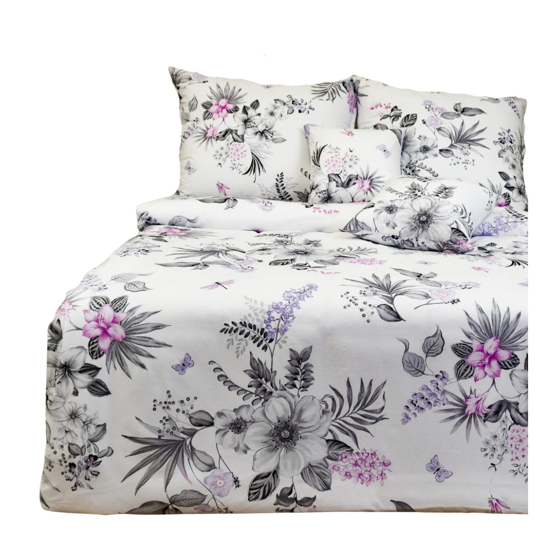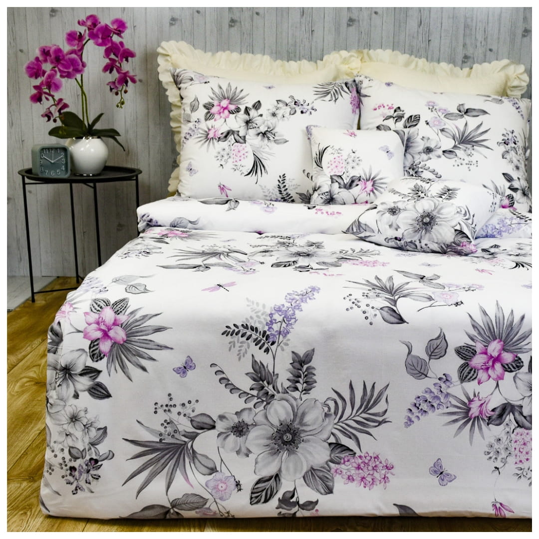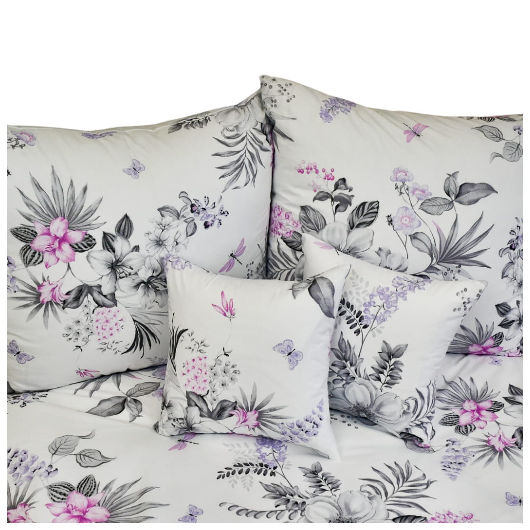 Komplet pościeli bawełnianej Azalia w rozmiarze 140x200 z delikatnym wzorem kwiatowym na białym tle. Na pościeli rozmieszczone są kwiaty w różnych odcieniach szarości z wyraźnymi różowymi i fioletowymi akcentami, co dodaje wzorowi głębi i wizualnego zainteresowania. Motywy kwiatowe są różnorodne, od dużych, okazałych kwiatów po drobne pąki i listki. Wzór jest elegancki i może pasować do wielu dekoracji wnętrz, od nowoczesnych po bardziej klasyczne.