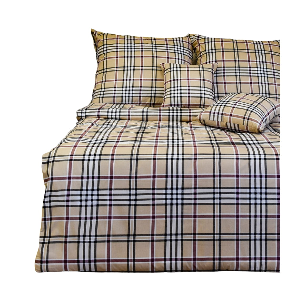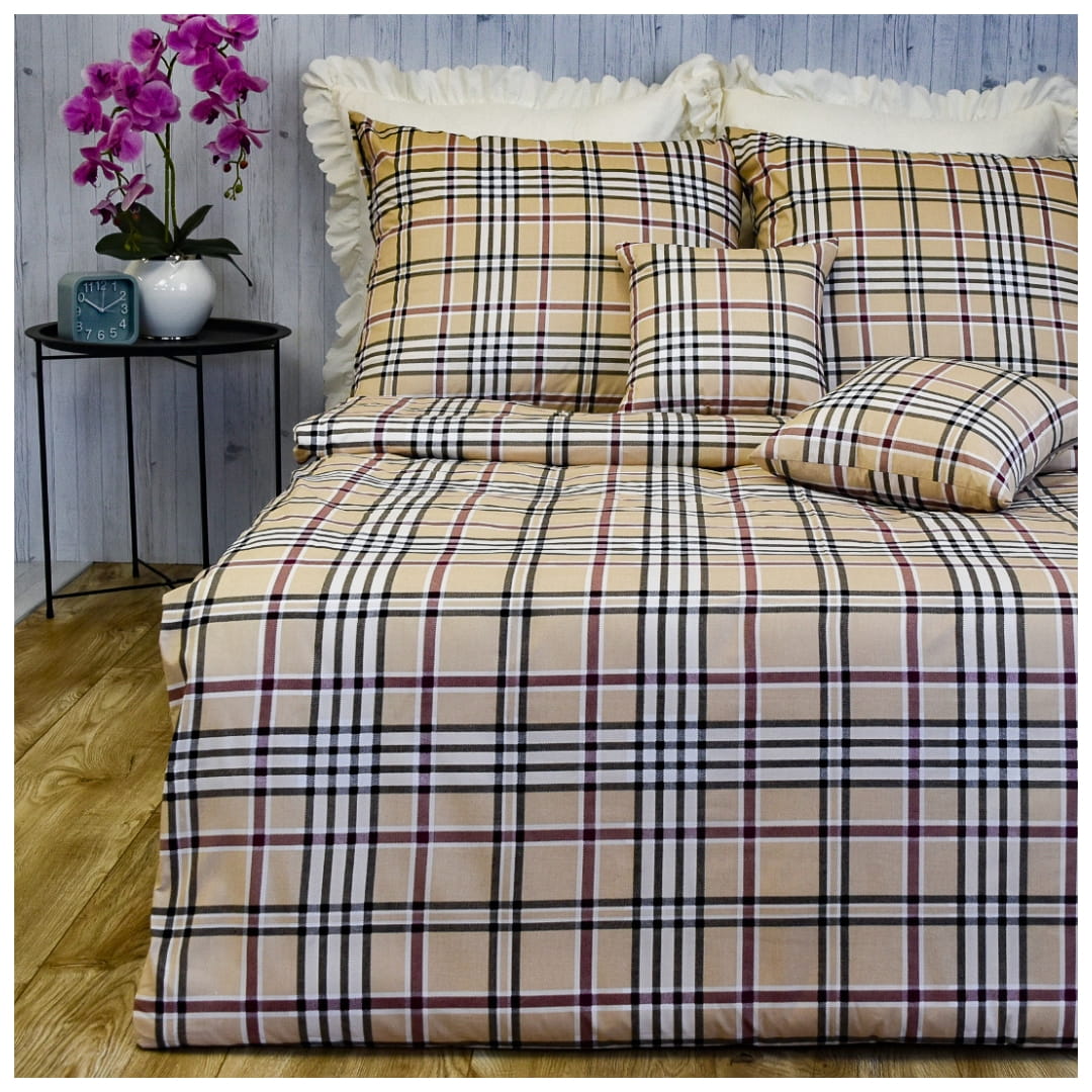 Komplet pościeli Bawełniana Krata Beżowa 140x200. Pościel posiada wzór w tradycyjną, wielobarwną kratkę. Dominujący beżowy kolor przepleciony białymi i czarnymi liniami, tworzącym regularny, geometryczny wzór. Wzór jest elegancki i może pasować do wielu dekoracji wnętrz, od nowoczesnych po bardziej klasyczne.