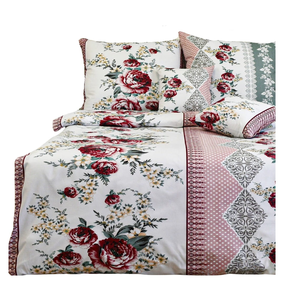 Komplet pościeli bawełnianej Kwiaty Groszki 140x200. Prezentowana pościel ma bogato zdobiony wzór nazywany "kwiaty groszki". Tło pościeli jest białe, a na nim znajdują się pasy w różnych odcieniach i wzorach, w tym głównie w kolorze zielonym i różowym. Motywami przewodnimi są eleganckie, czerwone róże oraz delikatne kwiaty i ozdobne elementy, takie jak koronki i geometryczne wzory. Pościel charakteryzuje się symetrią i regularnością w układzie wzorów, co nadaje jej klasyczny i uporządkowany wygląd.