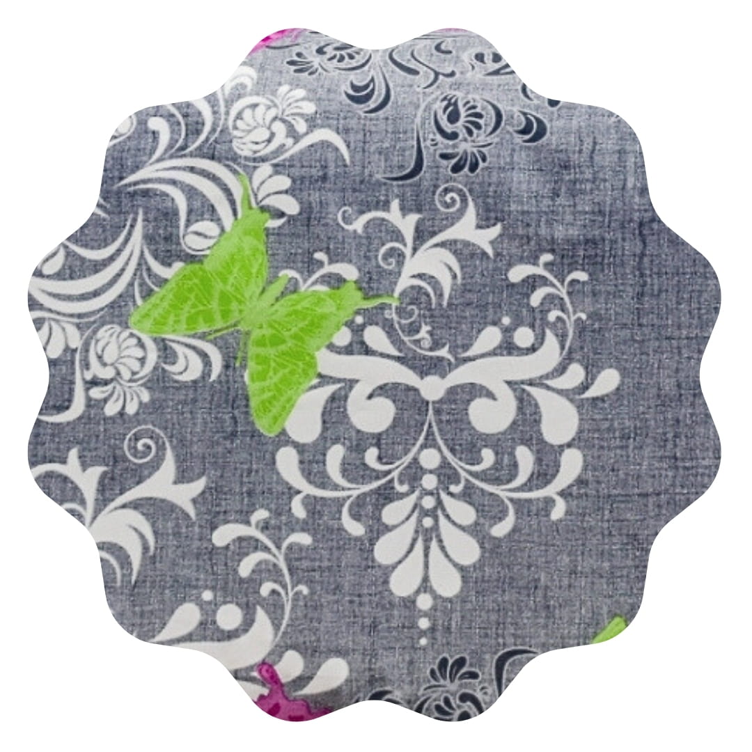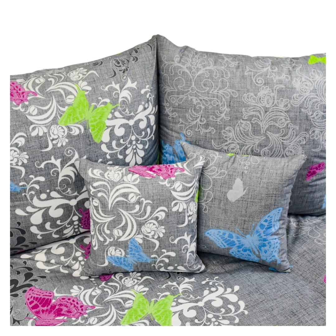 Komplet pościeli bawełnainej Motyl Na Szarym 140x200. Prezentowana pościel charakteryzuje się nowoczesnym wzornictwem na szarym tle. Głównym motywem jest bogato zdobiony, barokowy wzór roślinny w odcieniach szarości i bieli, który tworzy elegancką i subtelną bazę dla całego designu. Na tej monochromatycznej bazie wyróżniają się kolorowe akcenty w postaci mniejszych i większych motyli, które są rozrzucone na całej powierzchni pościeli. Kolory tych dodatków to intensywne odcienie różu, niebieskiego oraz jaskrawej zieleni, co dodaje zestawowi pościeli dynamiki i współczesnego charakteru. Wzór jest elegancki i może pasować do wielu dekoracji wnętrz, od nowoczesnych po bardziej klasyczne.