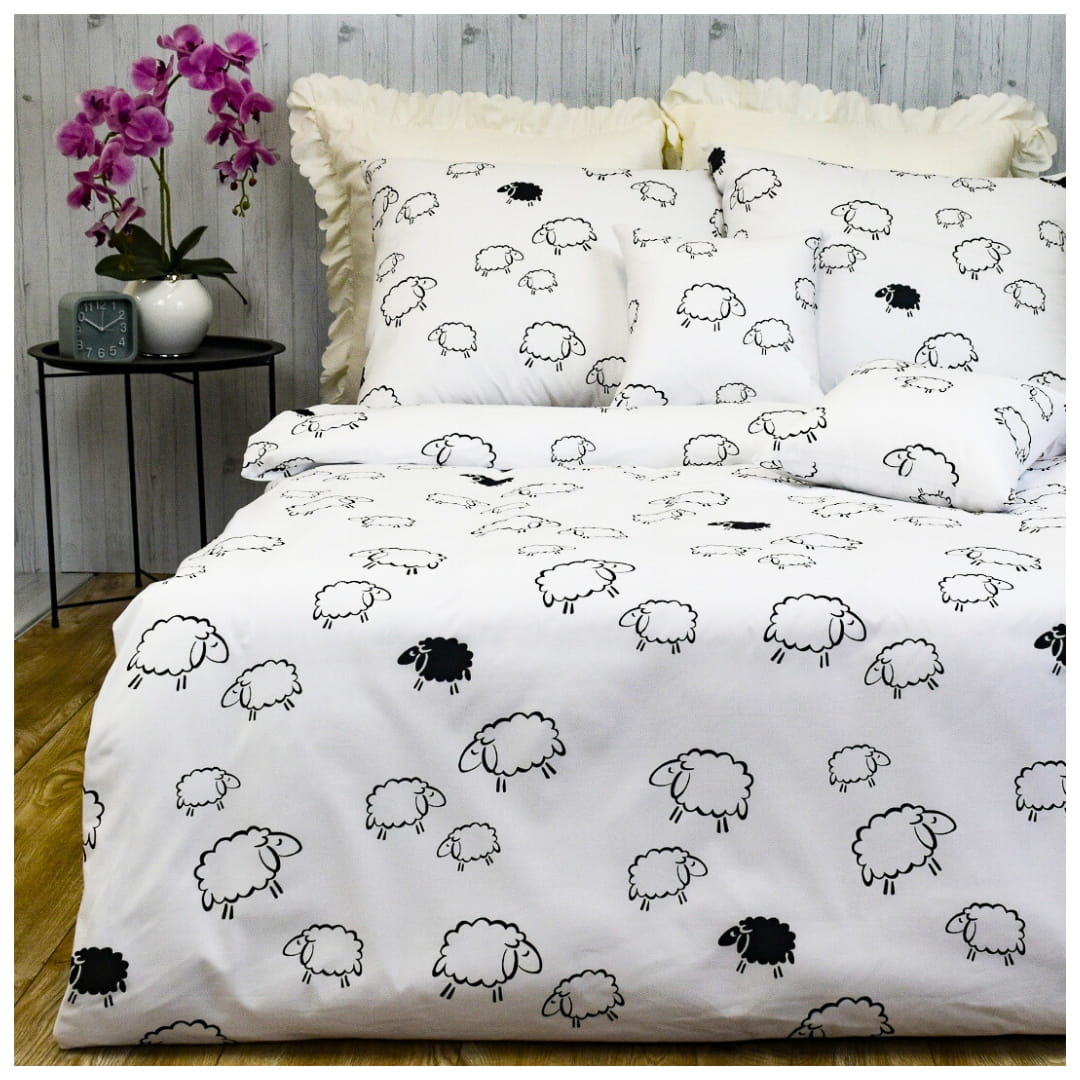 Komplet pościeli bawełnianej Owieczki Na Białym w rozmiarze 140x200. Pościel o wzorze zwanym "owieczki". Tło pościeli jest białe, a na nim rozłożone są proste, czarno-białe rysunki owiec. Owce są różnej wielkości, niektóre z nich są pełne czarne, a większość biała w czarnym obrysie. Wzór jest powtarzalny i sprawia wrażenie przytulnego oraz eleganckiego stylu. Wzór jest elegancki i może pasować do wielu dekoracji wnętrz, od nowoczesnych po bardziej klasyczne.