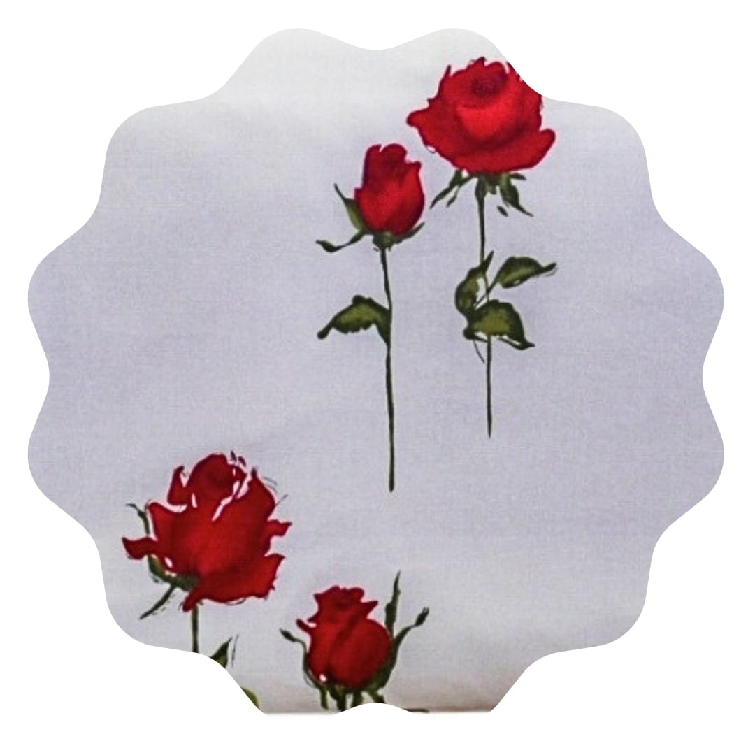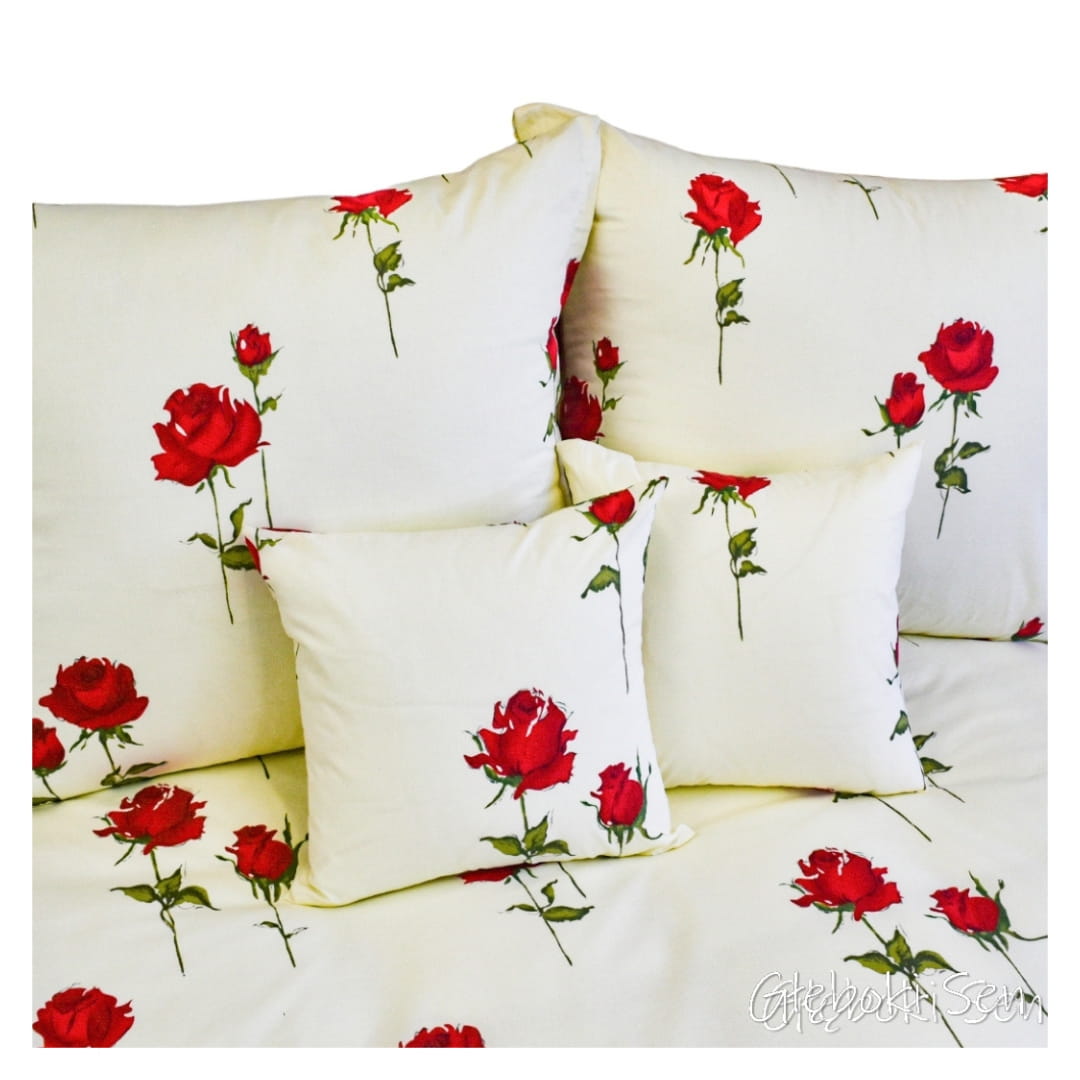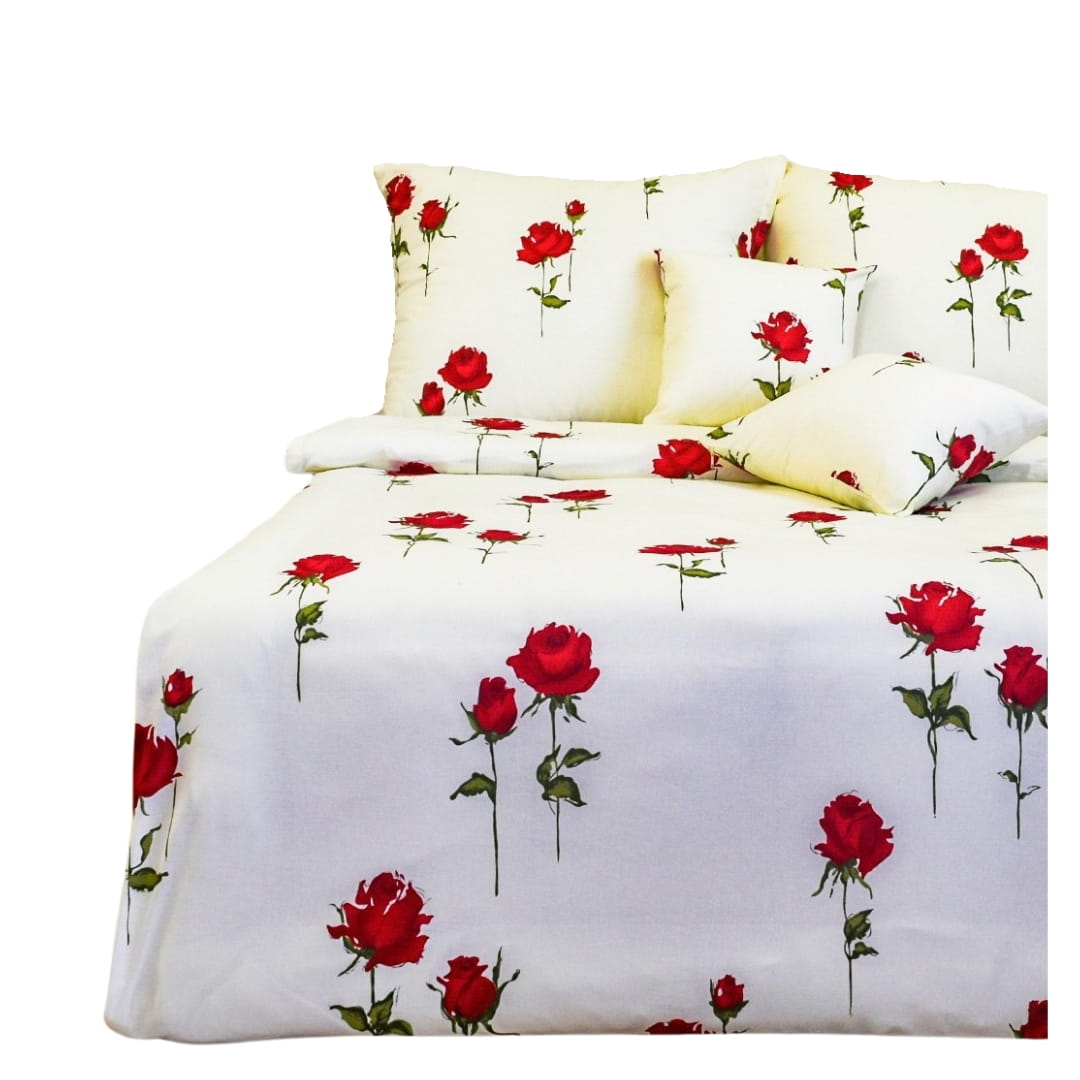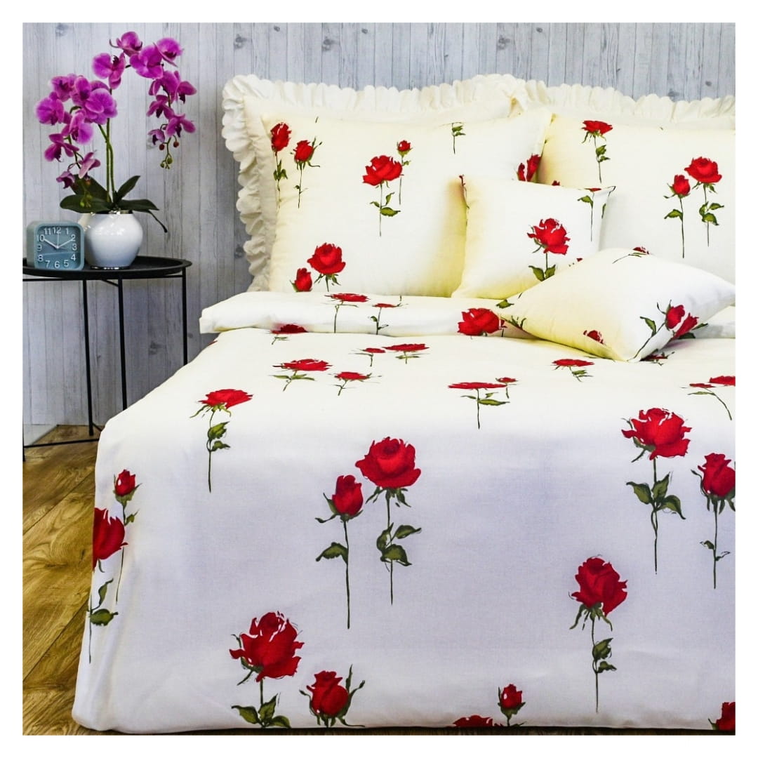 Komplet pościeli bawełnianej Róża Stojąca Krem w rozmiarze 140x200. Pościel o nazwie "róża stojąca" jest ozdobiona wzorem czerwonych róż na kremowym tle. Wzór przedstawia czerwone róże z zielonymi łodygami i liśćmi, które są równomiernie rozmieszczone na całej powierzchni pościeli, w tym na poduszkach i kołdrze. Kwiaty mają pełne, intensywnie czerwone płatki, a łodygi są smukłe i delikatne. Wzór jest elegancki i może pasować do wielu dekoracji wnętrz, od nowoczesnych po bardziej klasyczne.