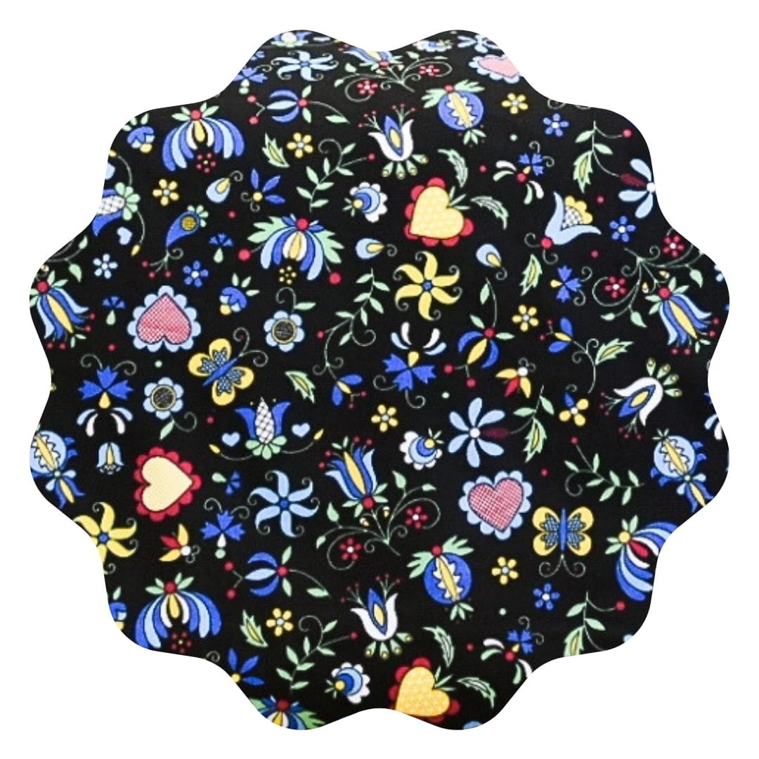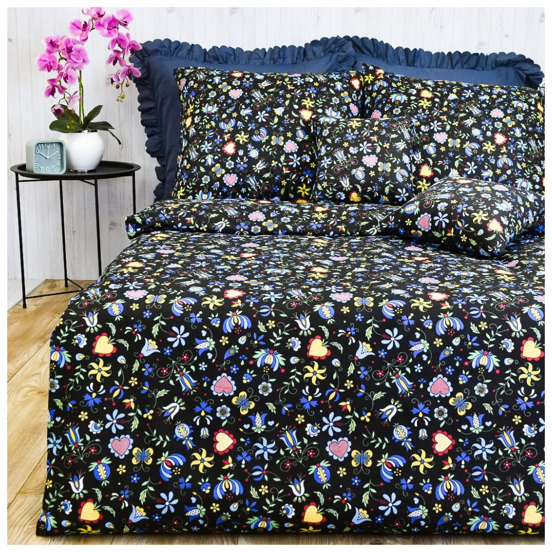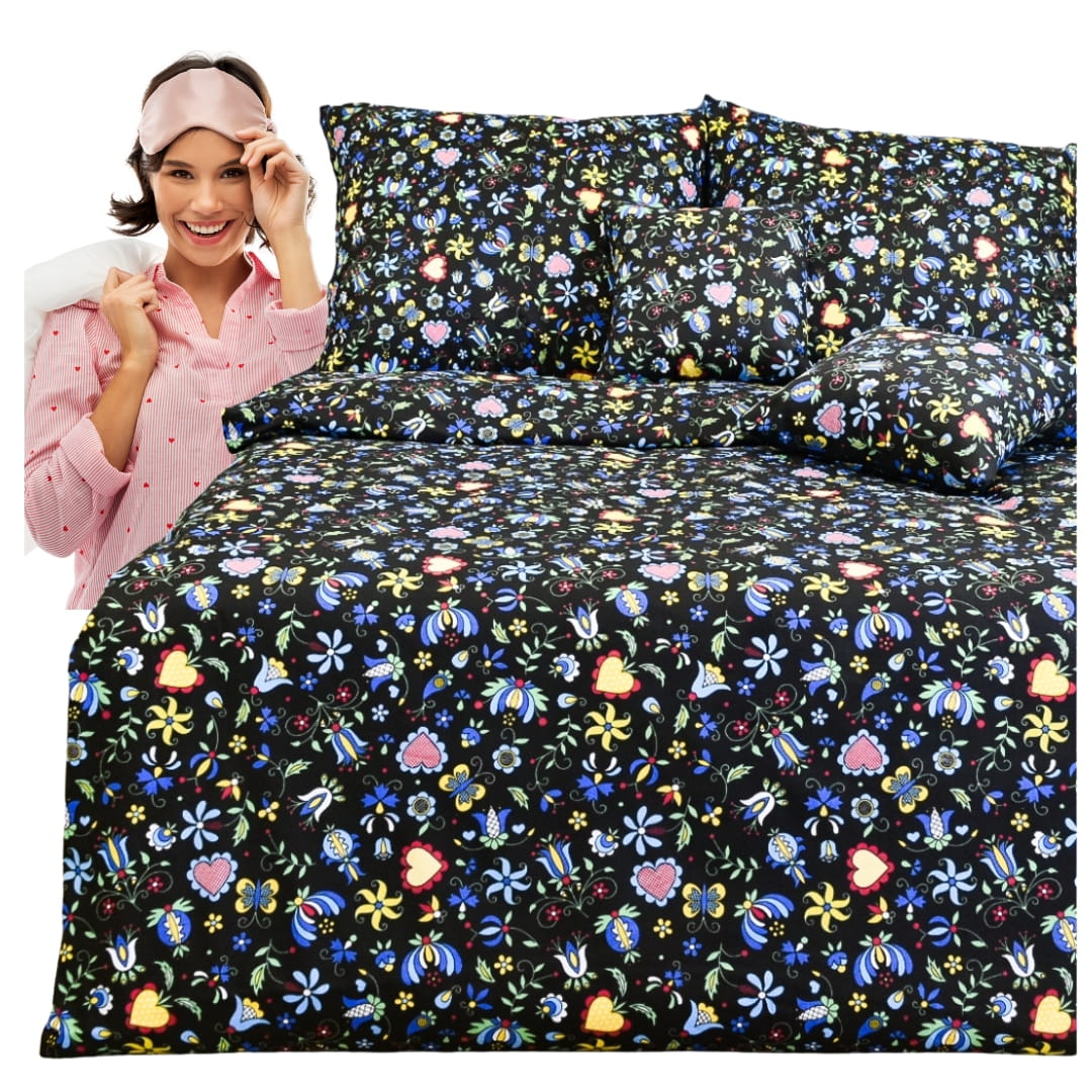 Komplet pościeli bawełnianej Kaszuby Czarne 140x200. Pościel bawełniana o nazwie "Kaszuby Czarne" przedstawia tradycyjny wzór kaszubski na czarnym tle. Wzór ten składa się z kolorowych motywów kwiatowych i roślinnych, które są charakterystyczne dla kaszubskiego haftu ludowego. Na pościeli dominują kwiaty w kolorach niebieskim, żółtym, czerwonym, różowym i zielonym. Wzór jest gęsto rozmieszczony, co nadaje pościeli żywy i dekoracyjny charakter. Czarne tło stanowi doskonały kontrast dla jasnych, wyrazistych kolorów, co sprawia, że wzór jest bardzo widoczny i efektowny.
