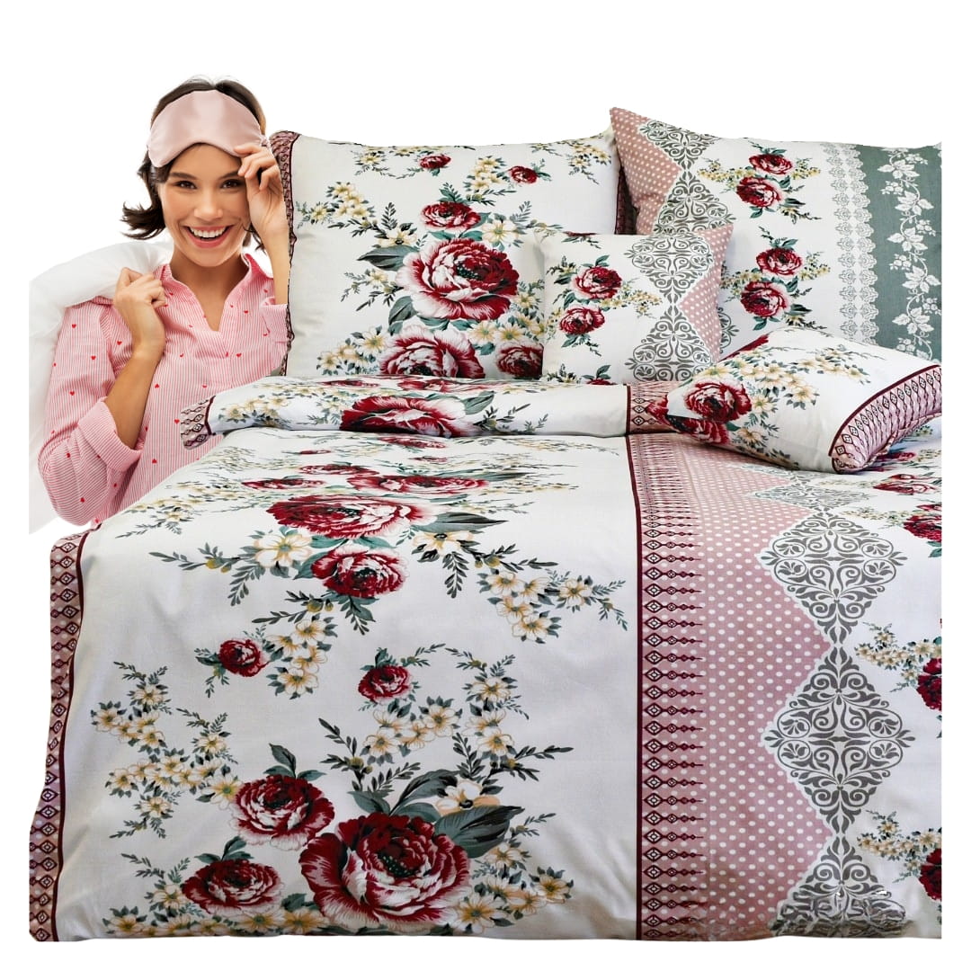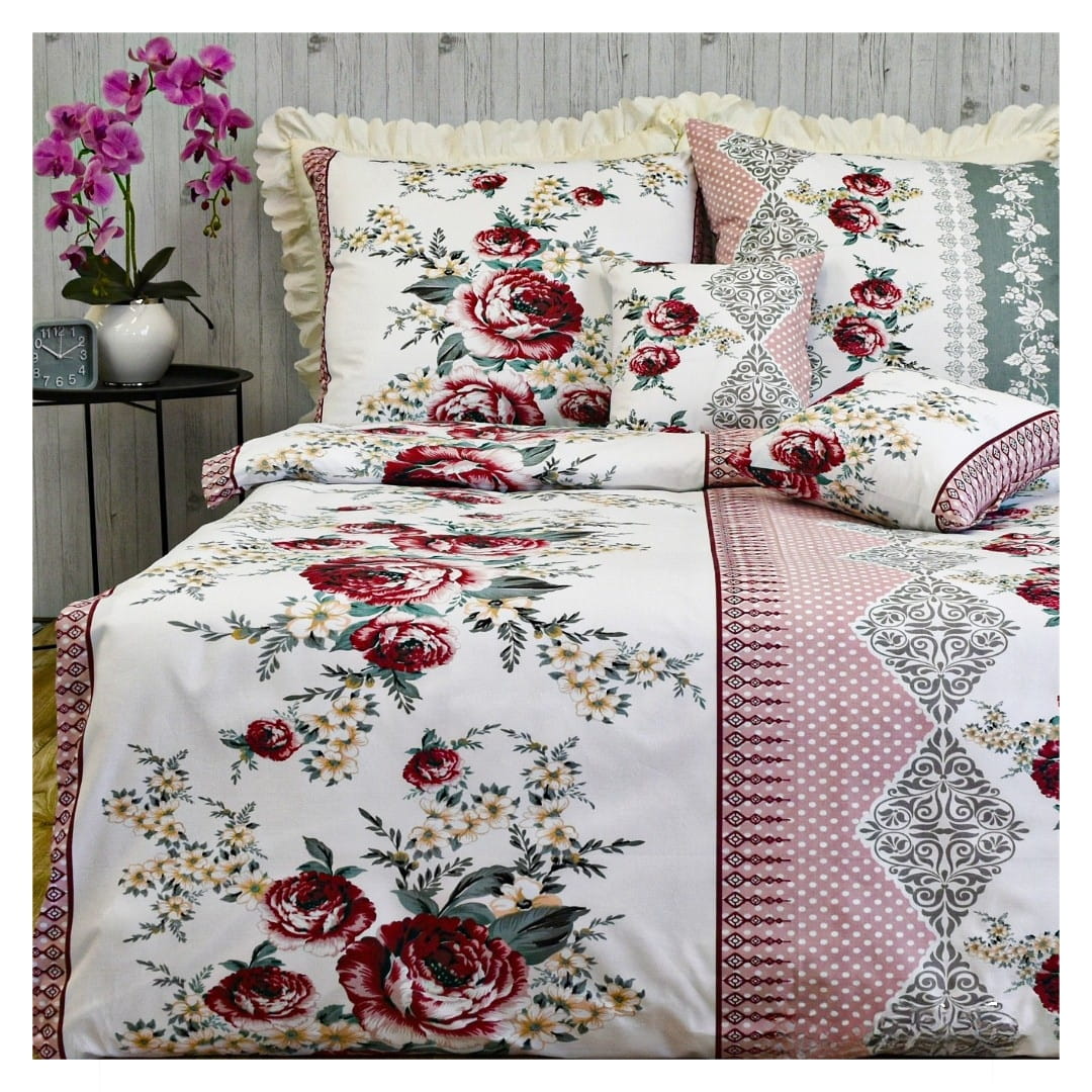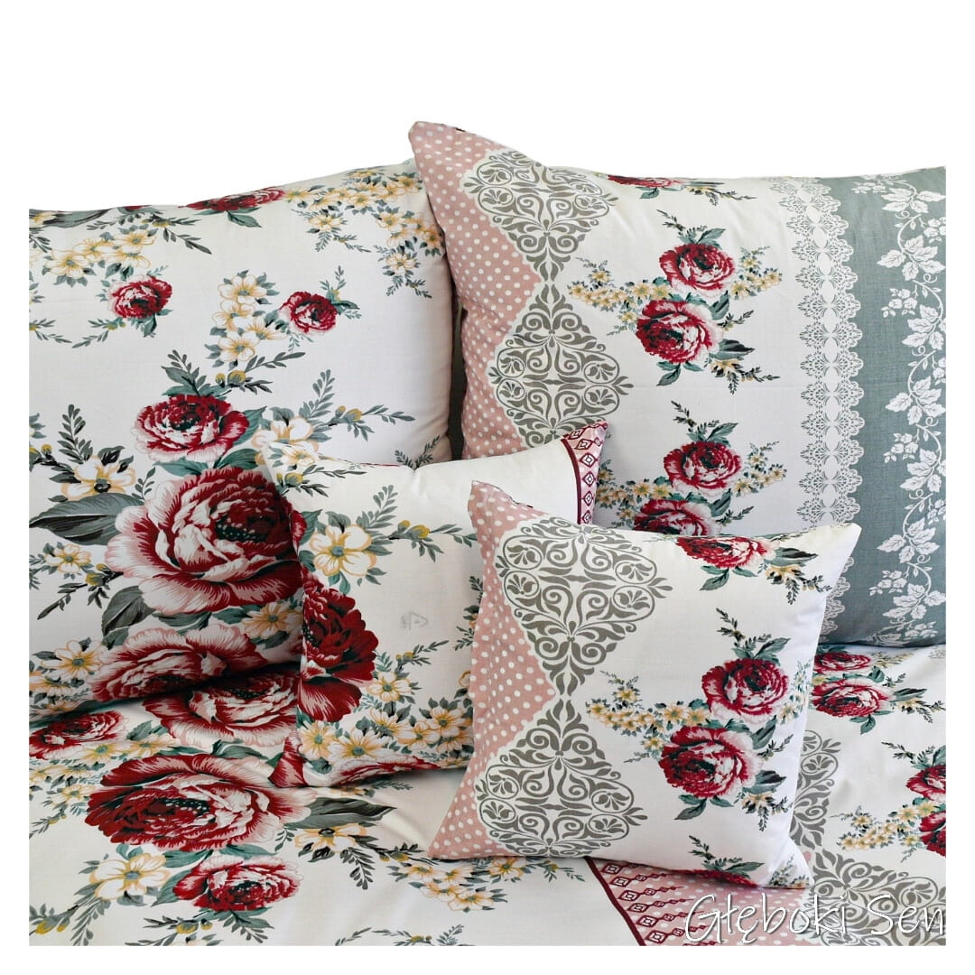 Komplet pościeli bawełnianej Kwiaty Groszki 140x200. Prezentowana pościel ma bogato zdobiony wzór nazywany "kwiaty groszki". Tło pościeli jest białe, a na nim znajdują się pasy w różnych odcieniach i wzorach, w tym głównie w kolorze zielonym i różowym. Motywami przewodnimi są eleganckie, czerwone róże oraz delikatne kwiaty i ozdobne elementy, takie jak koronki i geometryczne wzory. Pościel charakteryzuje się symetrią i regularnością w układzie wzorów, co nadaje jej klasyczny i uporządkowany wygląd.
