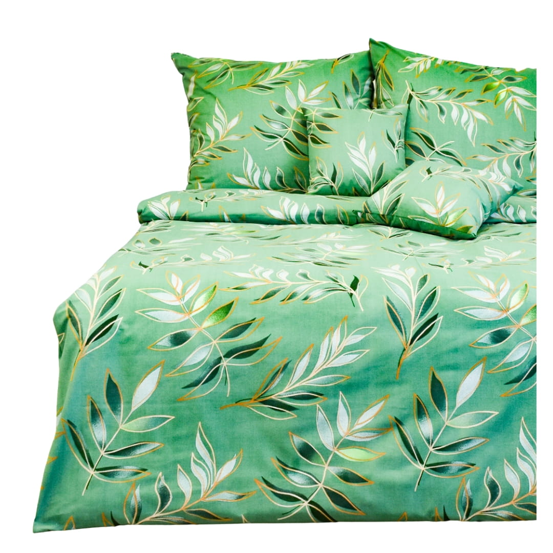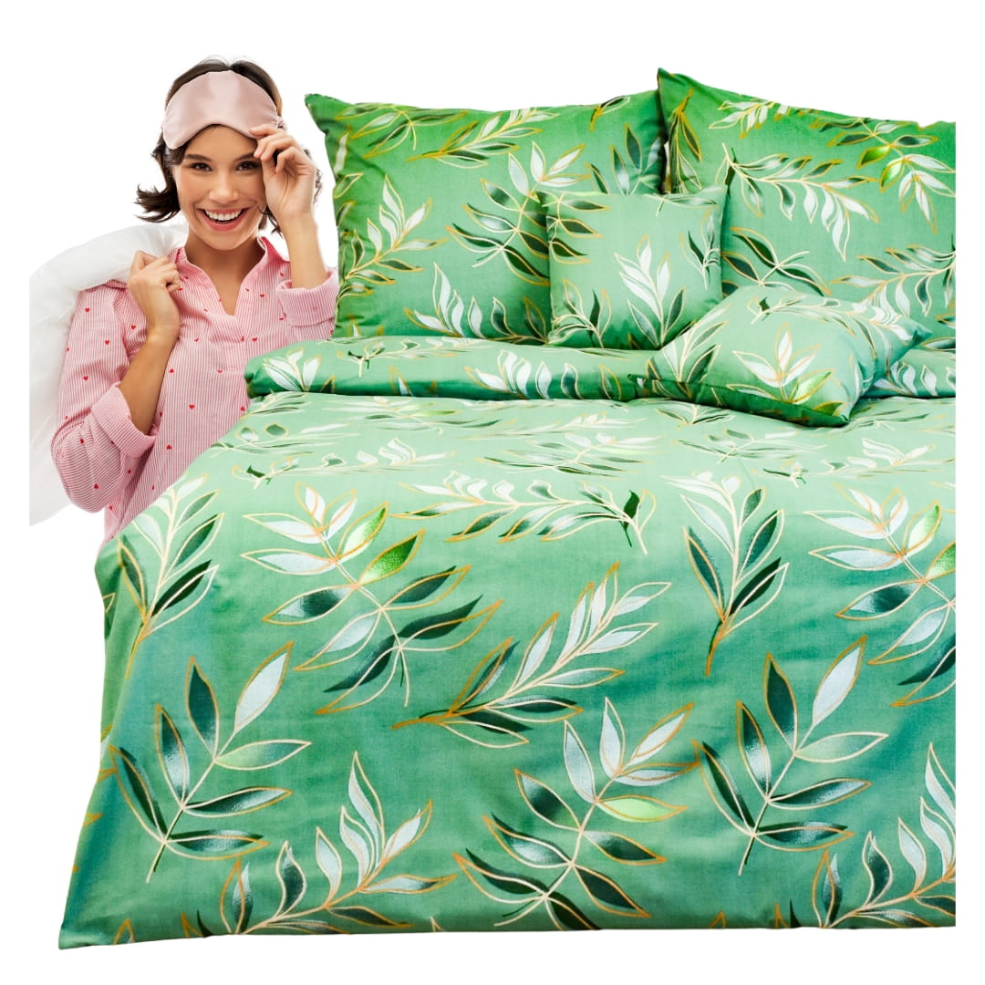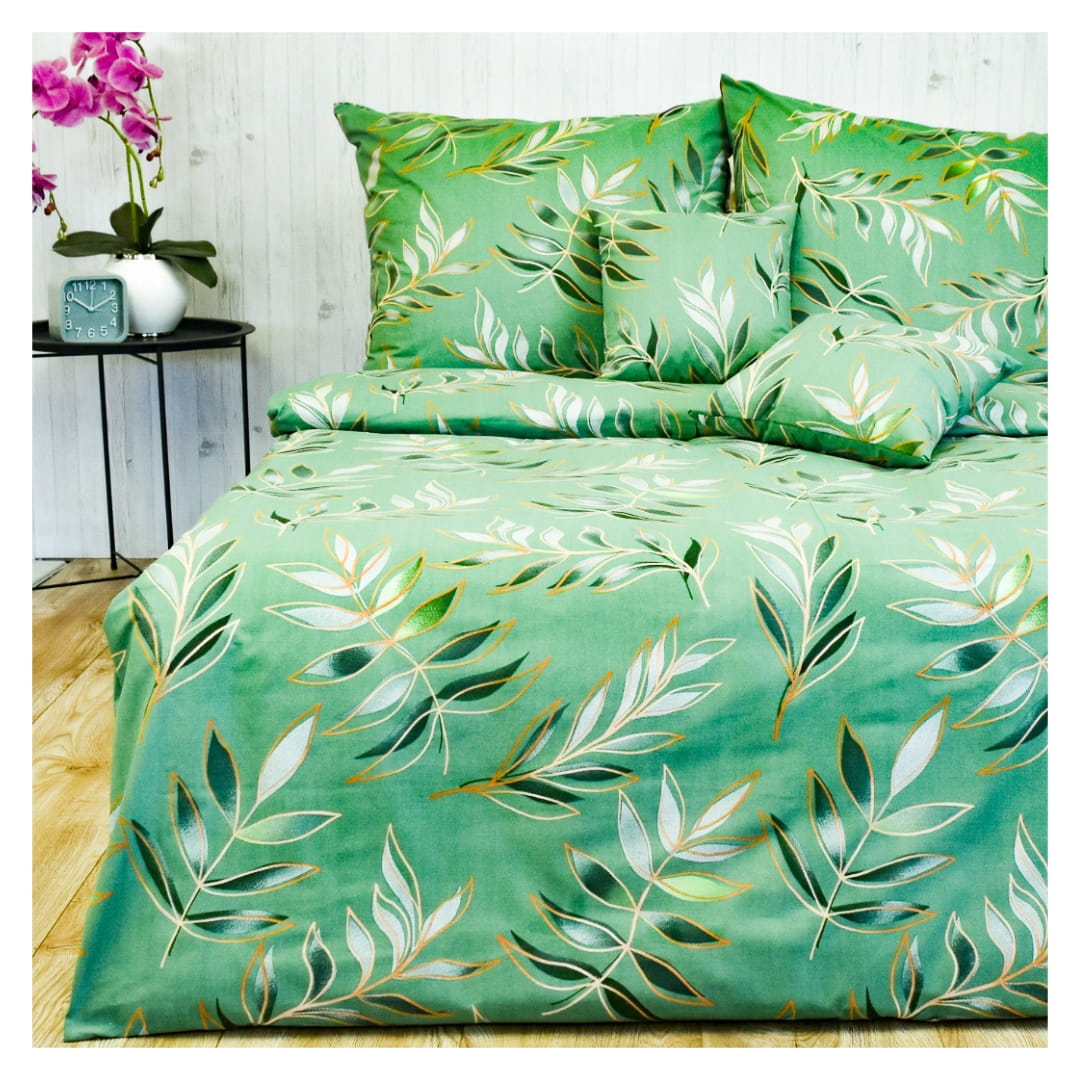 Komplet pościeli bawełnianej Eukaliptus 160x200. Pościel bawełniana Eukaliptus charakteryzuje się eleganckim, roślinnym wzorem, inspirowanym liśćmi eukaliptusa. Tkanina ma dominujący zielony odcień, tworząc subtelny efekt głębi. Na całej powierzchni widoczne są delikatne gałązki eukaliptusa z liśćmi w różnych odcieniach zieleni, bieli oraz złota. Złote kontury nadają wzorowi elegancji i lekko połyskują, dodając pościeli wyjątkowego uroku. Całość prezentuje się naturalnie i świeżo, dzięki czemu pościel idealnie pasuje do wnętrz inspirowanych naturą, stylem boho lub nowoczesnym minimalizmem. Jest to doskonały wybór dla osób, które cenią sobie spokojne, relaksujące wzory w sypialni.