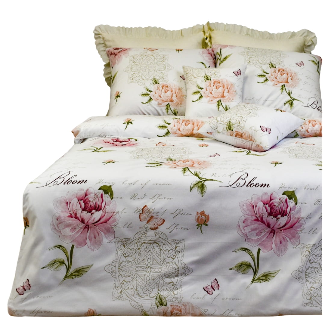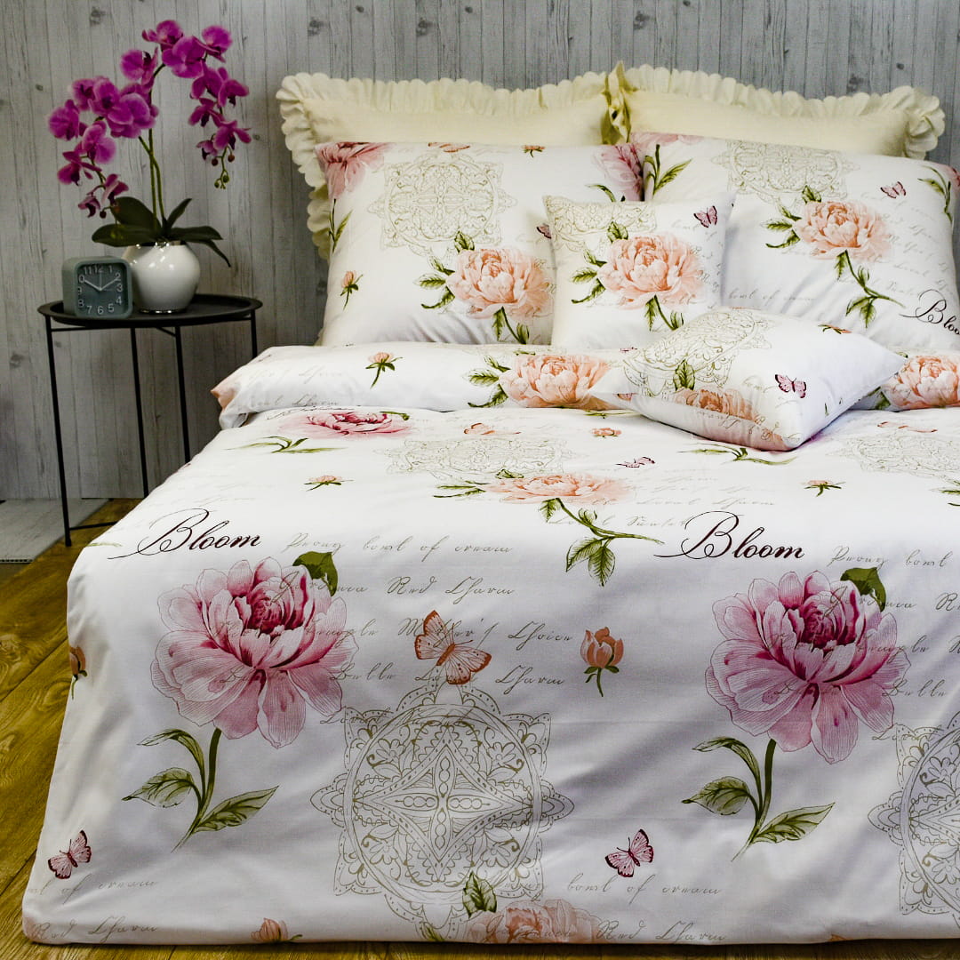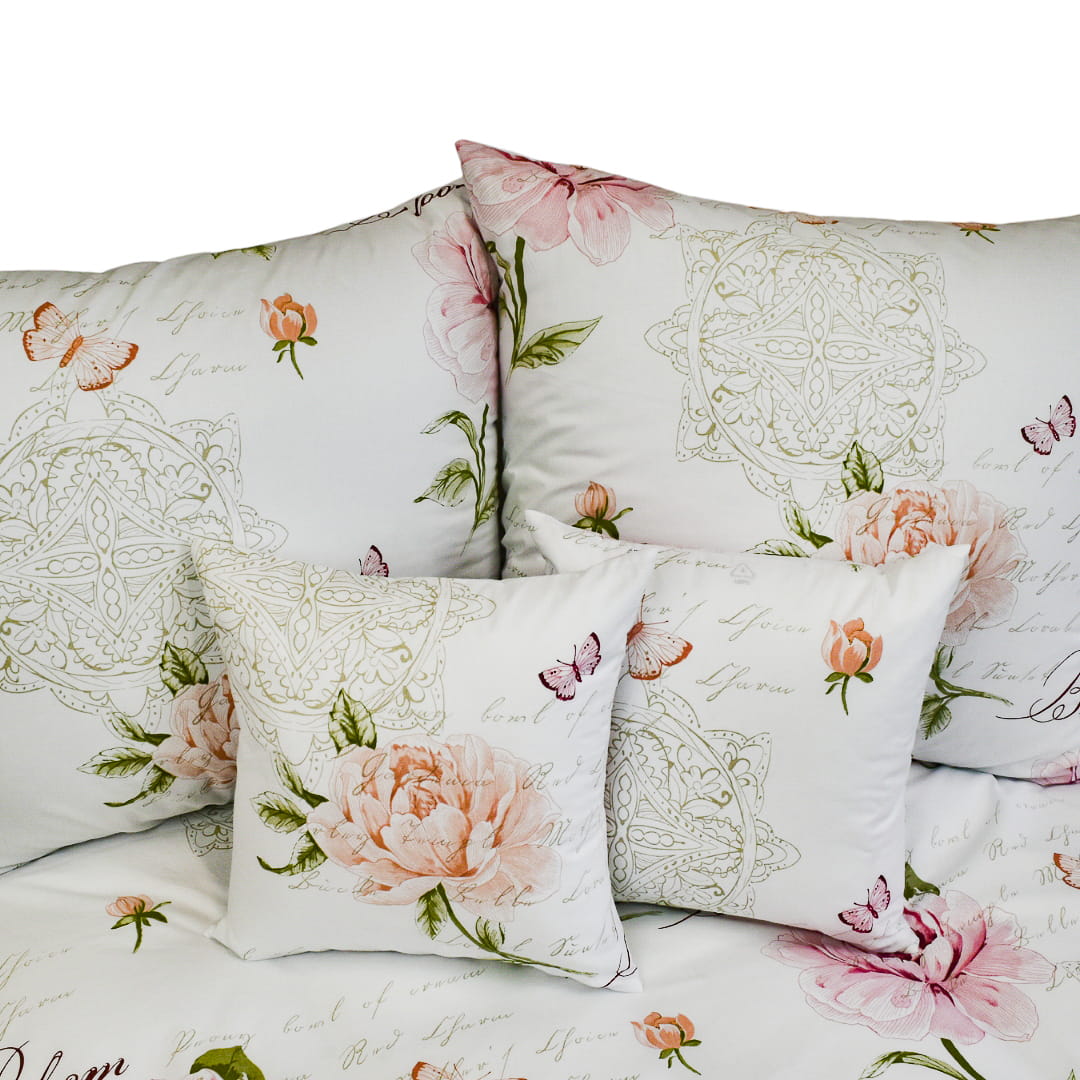 Komplet pościeli bawełnianej Motyle Piwonie Róż 160x200. Pościel bawełniana o nazwie Motyle Piwonie Róż ma elegancki, romantyczny wzór na białym tle. Głównym motywem są duże, różowe piwonie, które są rozmieszczone na całej powierzchni pościeli. Kwiaty są delikatnie cieniowane, co nadaje im trójwymiarowy wygląd. Wzór zdobią subtelne, różowe i pomarańczowe motyle, które unoszą się wokół kwiatów, dodając całości lekkości i wdzięku. Na pościeli widnieje elegancki napis „Bloom” (ang. „rozkwit”), wpisujący się w ogólny romantyczny styl. Wzór uzupełniają delikatne, koronkowe wzory oraz dekoracyjne detale, które w tle dodają subtelności i klasycznego uroku. Całość utrzymana jest w pastelowej kolorystyce, tworząc spokojny, elegancki efekt, idealny do sypialni w stylu romantycznym.