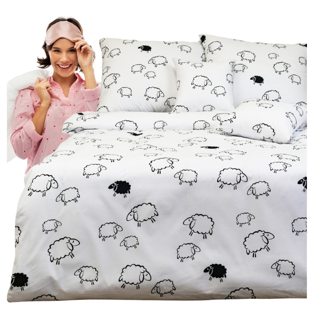 Komplet pościeli bawełnianej Owieczki Na Białym w rozmiarze 160x200. Pościel o wzorze zwanym "owieczki". Tło pościeli jest białe, a na nim rozłożone są proste, czarno-białe rysunki owiec. Owce są różnej wielkości, niektóre z nich są pełne czarne, a większość biała w czarnym obrysie. Wzór jest powtarzalny i sprawia wrażenie przytulnego oraz eleganckiego stylu. Wzór jest elegancki i może pasować do wielu dekoracji wnętrz, od nowoczesnych po bardziej klasyczne.