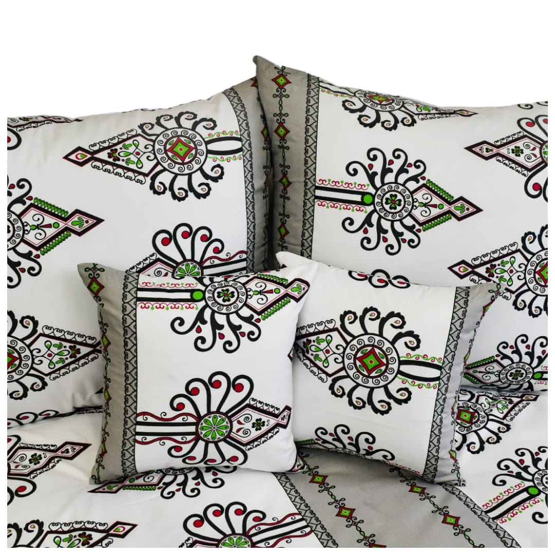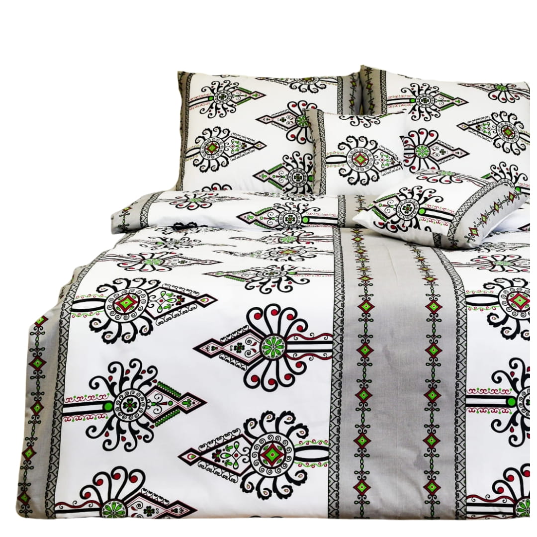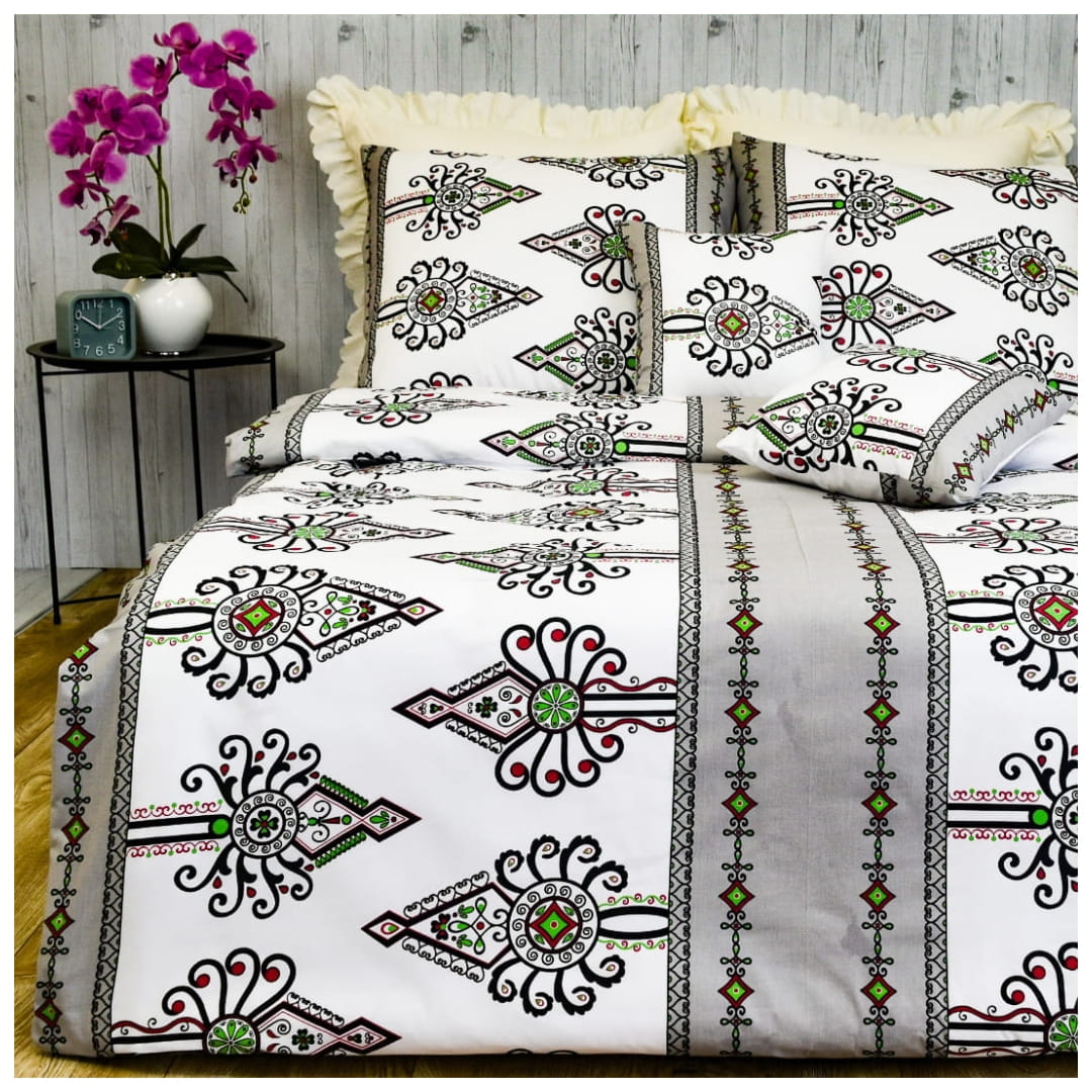 Komplet pościeli bawełnianej Parzenice Szare w rozmiarze 160x200. Pościel prezentuje tradycyjny wzór góralski zwanym "parzenicami". Charakterystyczny dla kultury Podhala, wzór składa się z złożonych, symetrycznych kształtów przypominających rozety lub dekoracyjne hafty. Parzenice na tej pościeli są w kolorach czarnych, z dodatkiem czerwieni i zieleni, na białym tle. Są one umieszczone w regularnych odstępach, tworząc elegancki i harmonijny design. Dodatkowo, pościel ozdobiona jest pionowymi szarymi pasami z mniejszymi motywami geometrycznymi i roślinnymi, które dodają całości wyrafinowanego charakteru.