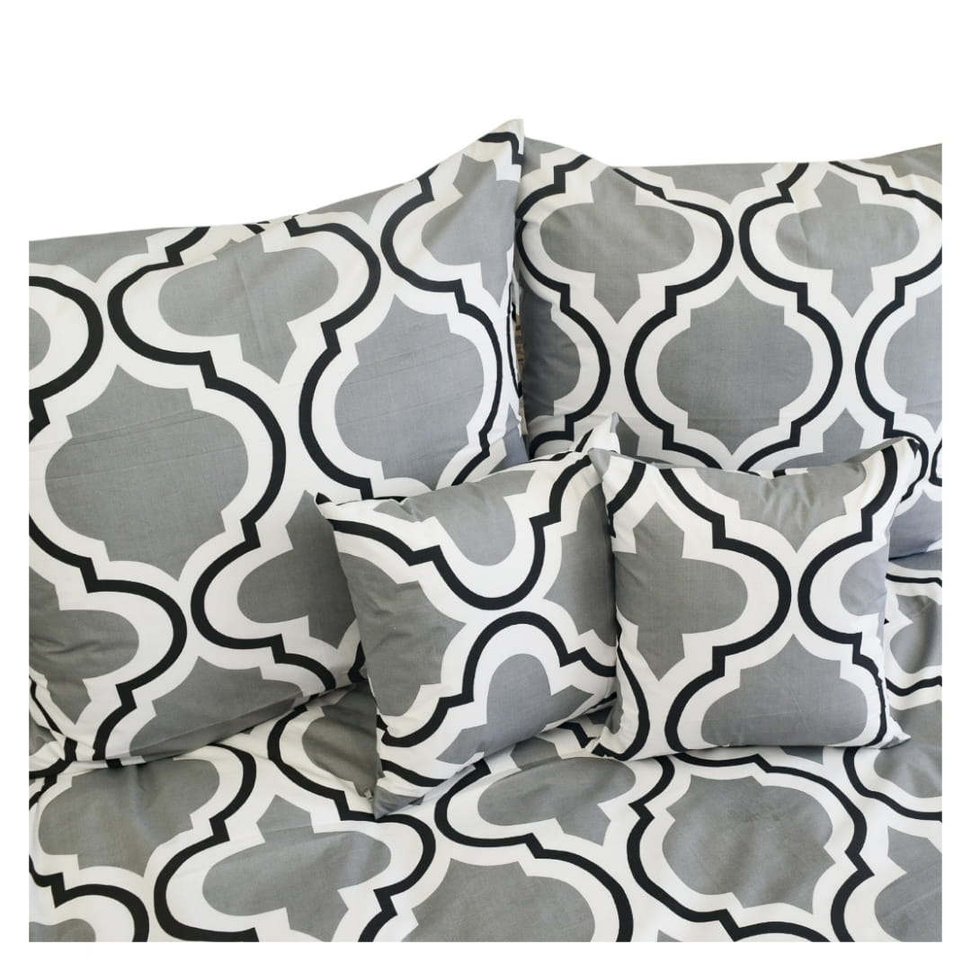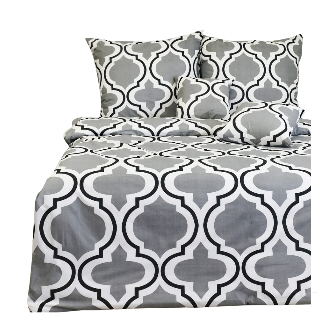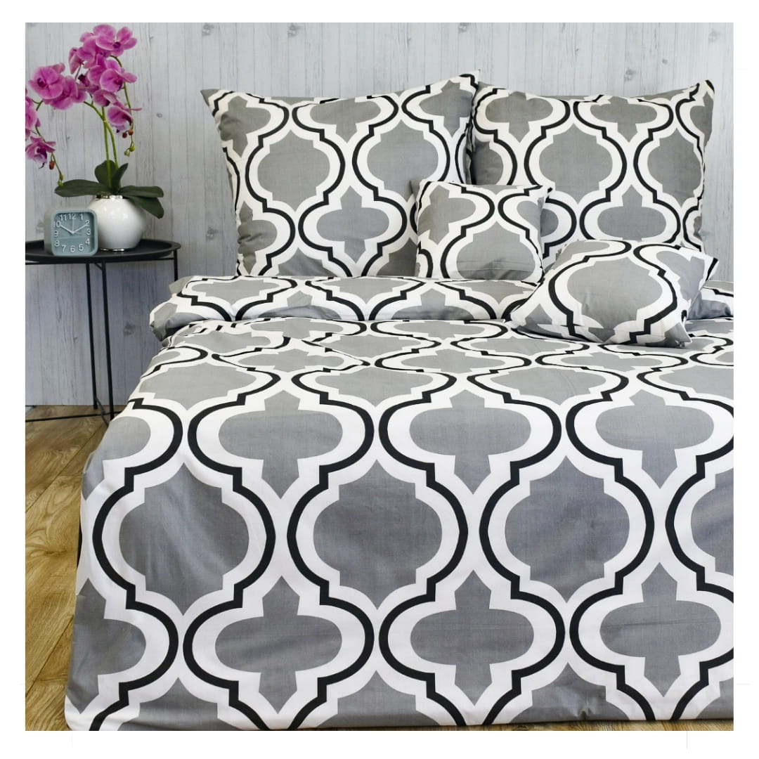 Komplet pościeli bawełnianej Maroko Duże Szare 220x200. Wzór pościeli to klasyczny motyw marokańskiej koniczyny (znany również jako "moroccan trellis" lub "quatrefoil"). Jest to geometryczny, symetryczny wzór często spotykany w designie inspirowanym kulturą Maroka. Nazwa „Maroko duże szare” odnosi się do stylu wzoru, wielkość elementów wzoru (duży, wyraźny print) oraz kolor, który jest intensywny, szary. To bardzo popularny motyw w nowoczesnym stylu boho lub orientalnym.