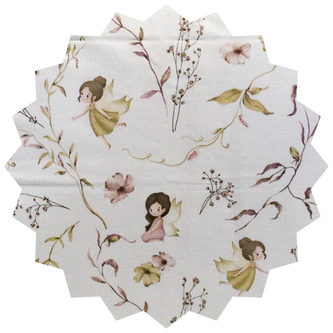 Komplet pościeli dziecięcej Wróżki Biel w rozmiarze 100x135 z poszewką w rozmiarze 40x60. Wzór pościeli „Wróżki Biel” jest delikatny i bajkowy, utrzymany w jasnej, białej kolorystyce. Na tle subtelnych gałązek i drobnych kwiatów rozmieszczone są ilustracje małych wróżek w pastelowych sukienkach. Całość tworzy lekki, dziewczęcy i spokojny motyw, idealny do dziecięcej sypialni, nadający jej przytulny i magiczny charakter.