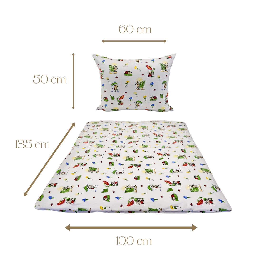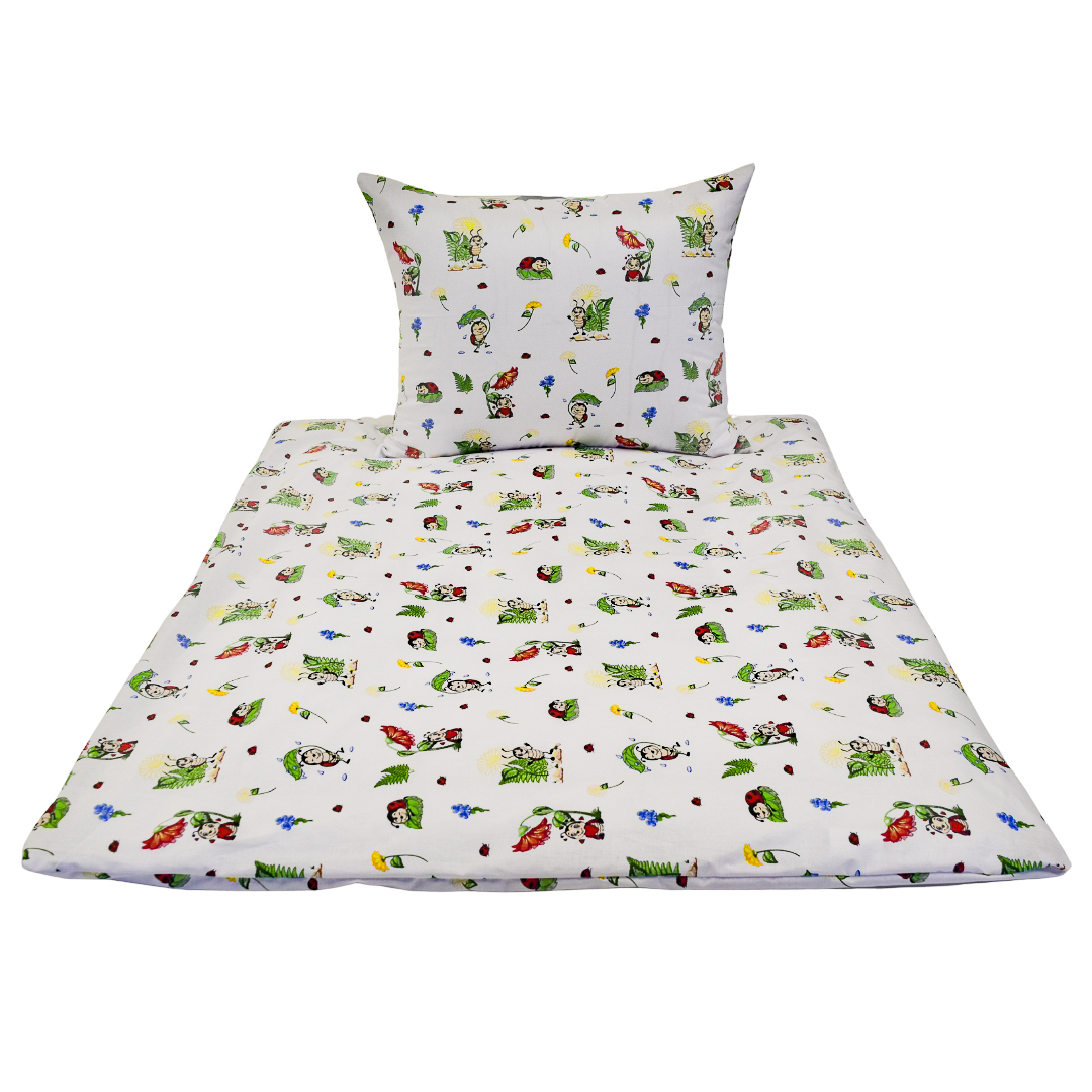 Komplet pościeli dziecięcej Biedronki Białe w rozmiarze 100x135 z poszewką w rozmiarze 50x60. Pościel dziecięca „Biedronki białe” ma białe tło, które nadaje jej świeży i spokojny wygląd. Wzór tworzą urocze, bajkowe biedronki w różnych pozach, przeplatane kolorowymi kwiatkami i zielonymi listkami. Całość przypomina wesołą łąkę pełną drobnych, naturalnych motywów. Kolory są delikatne, ale żywe, dzięki czemu pościel wygląda radośnie i przyjaźnie dla dziecka.