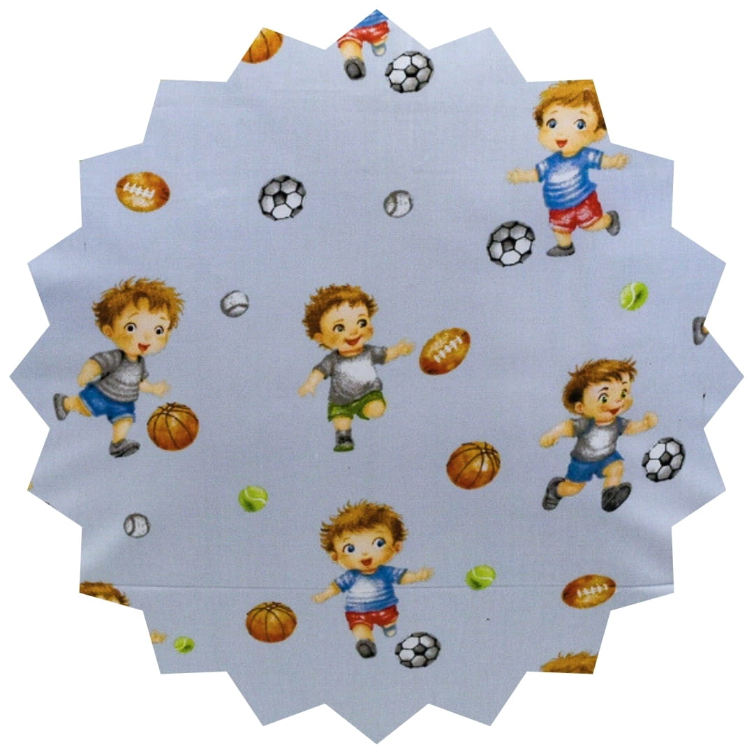 Komplet pościeli dziecięcej Piłkarzyki Błękit w rozmiarze 100x135 z poszewką w rozmiarze 50x60 ma jasnobłękitne tło, na którym powtarza się wzór uśmiechniętych chłopców bawiących się piłkami. Dzieci przedstawione są w ruchu, kopią lub podrzucają różne piłki – głównie nożne, ale też do koszykówki czy baseballa. Całość ma radosny, dynamiczny charakter i sportowy klimat, idealny do pokoju małego fana aktywności. Kolorystyka jest delikatna i przyjemna dla oka, z przewagą błękitu, zieleni i ciepłych brązów.