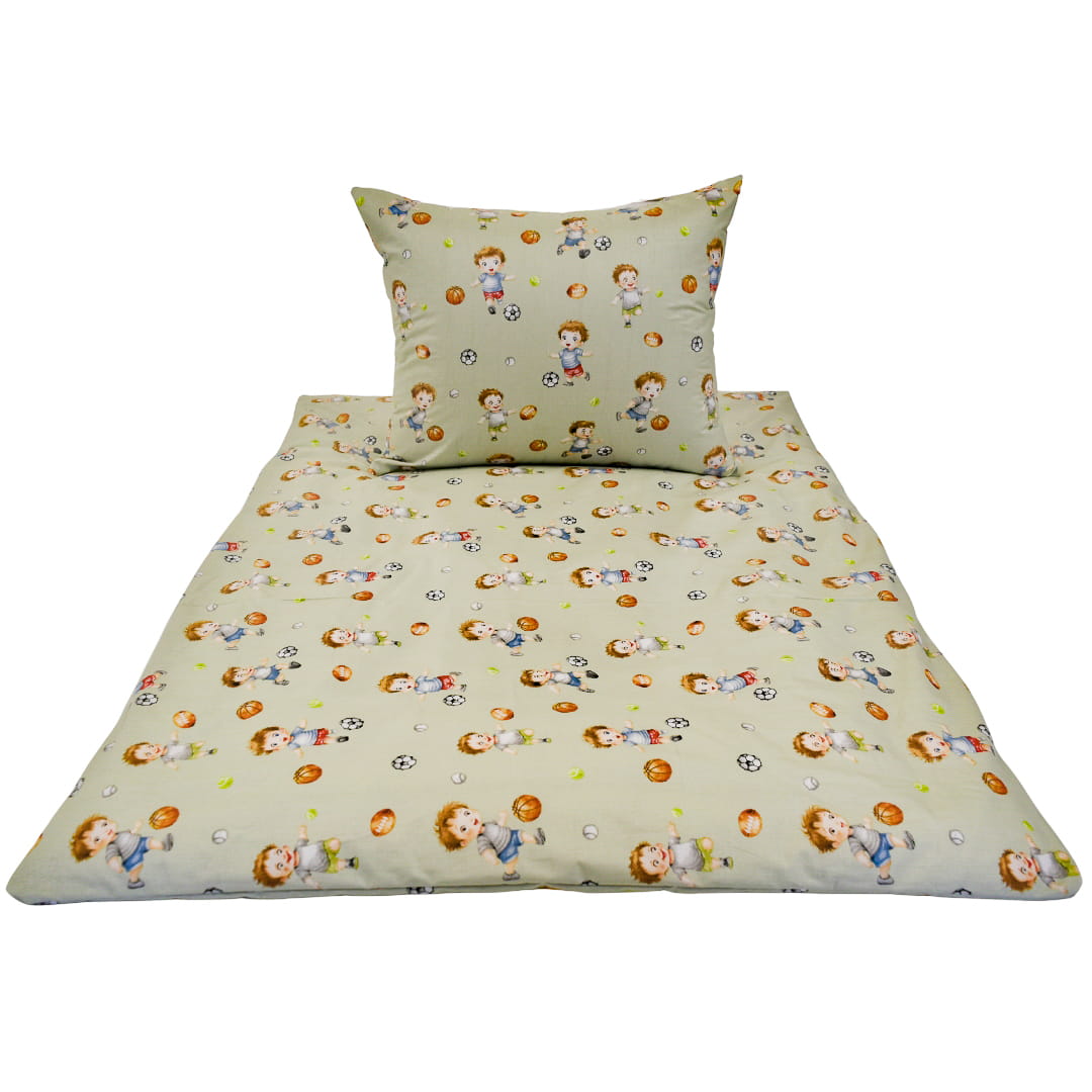 Komplet pościeli dziecięcej Piłkarzyki Oliwka w rozmiarze 100x160 z poszewką w rozmiarze 40x60 ma oliwkowe tło, na którym powtarza się wzór uśmiechniętych chłopców bawiących się piłkami. Dzieci przedstawione są w ruchu, kopią lub podrzucają różne piłki – głównie nożne, ale też do koszykówki czy baseballa. Całość ma radosny, dynamiczny charakter i sportowy klimat, idealny do pokoju małego fana aktywności. Kolorystyka jest delikatna i przyjemna dla oka, z przewagą oliwki, zieleni i ciepłych brązów.