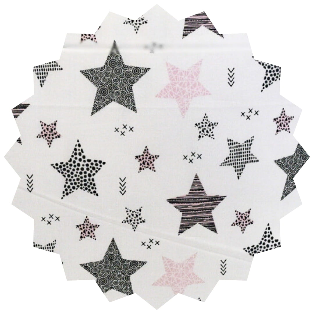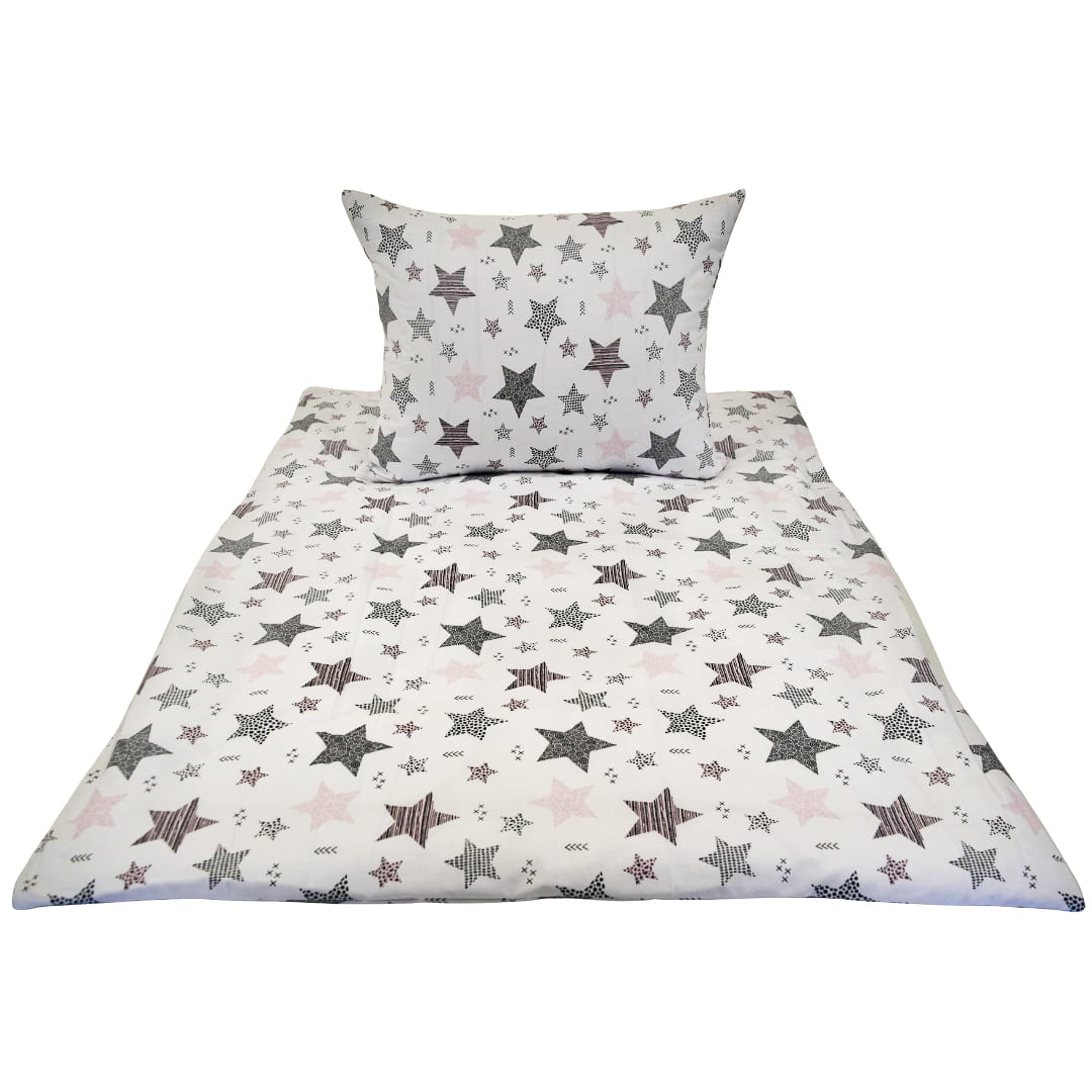 Komplet pościeli dziecięcej Magia Gwiazd Róż w rozmiarze 100x160 z poszewką w rozmiarze 50x60 utrzymana jest w jasnej, białej kolorystyce z delikatnym wzorem gwiazd w odcieniach szarości, grafitu i pudrowego różu. Gwiazdki mają różne wielkości i wypełnienia – kropki, paski oraz drobne wzory, co nadaje całości lekkości i subtelnej dynamiki. Wzór jest spokojny i harmonijny, idealny do stworzenia przytulnej, sennej atmosfery w pokoju dziecka. Całość ma nowoczesny, ale jednocześnie bardzo delikatny i uniwersalny charakter.