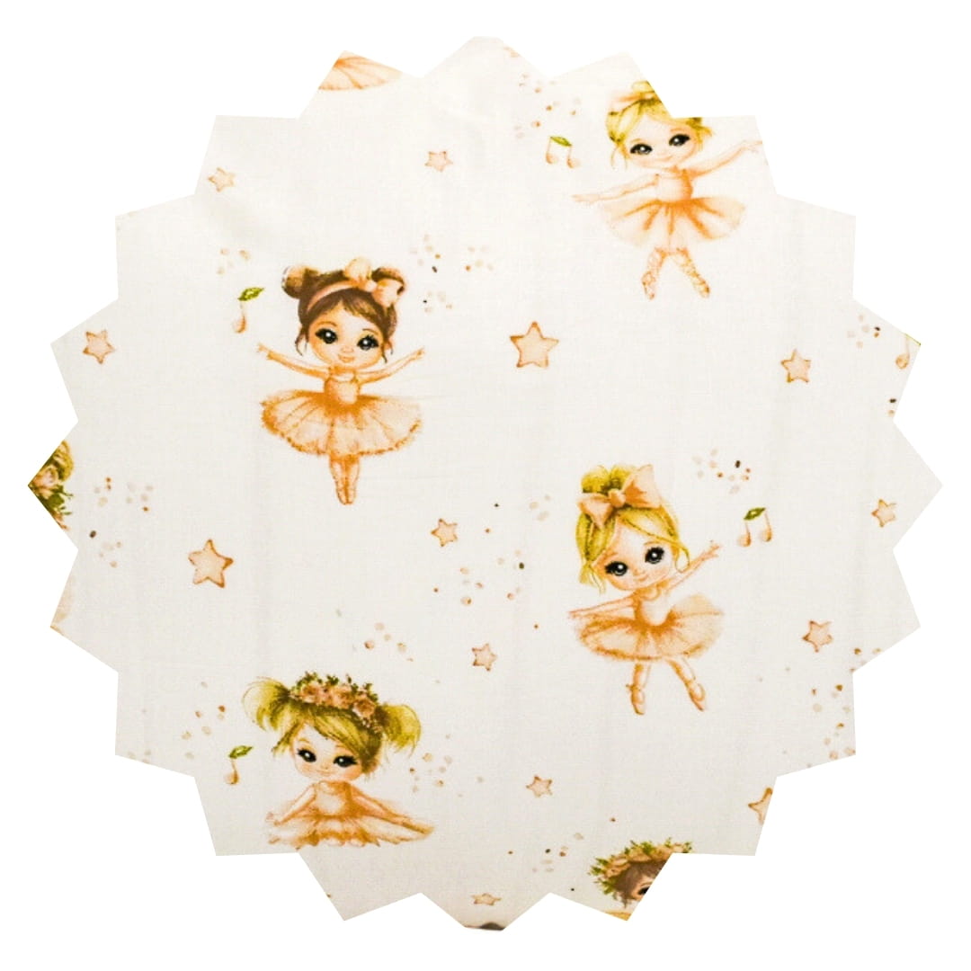 Dziewczynki ubrane są w klasyczne tiulowe spódniczki w odcieniach brzoskwiniowego różu i beżu, a ich włosy zdobią kokardki, kwiatowe wianki i tiary. Całość wzbogacona jest o subtelne elementy, takie jak małe gwiazdki i błyszczące akcenty, które dodają pościeli magicznego, bajkowego uroku.