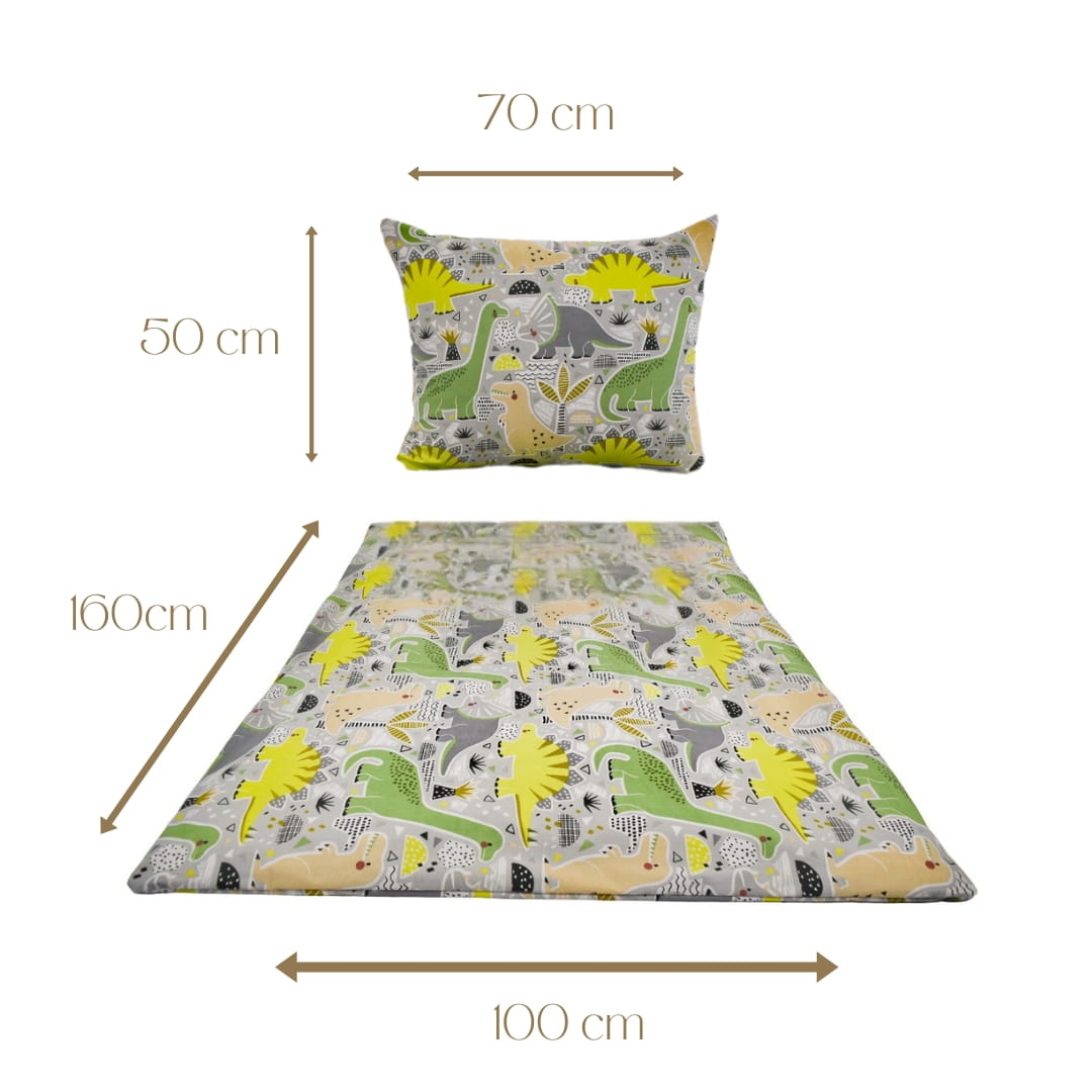 Komplet pościeli dziecięcej Dinozaury w rozmiarze 100x160 z poszewką w rozmiarze 50x70. Pościel dziecięca „Dinozaury” ma uroczy, kolorowy wzór, który z pewnością spodoba się najmłodszym fanom prehistorycznych stworzeń. Na jasnym tle znajdują się ilustracje różnych gatunków dinozaurów w pastelowych kolorach, takich jak zielony, szary, żółty i beżowy. Dinozaury są przedstawione w prosty, zabawny sposób, z detalami dodającymi charakteru, takimi jak kropki, kreski i geometryczne wzory. Pośród dinozaurów znajdują się także inne elementy przyrodnicze, takie jak stylizowane rośliny i słońca, co nadaje pościeli przyjemny, radosny klimat. Wzór jest powtarzalny, co tworzy efekt pełny życia i koloru na całej powierzchni pościeli, zarówno na kołdrze, jak i na poduszce.