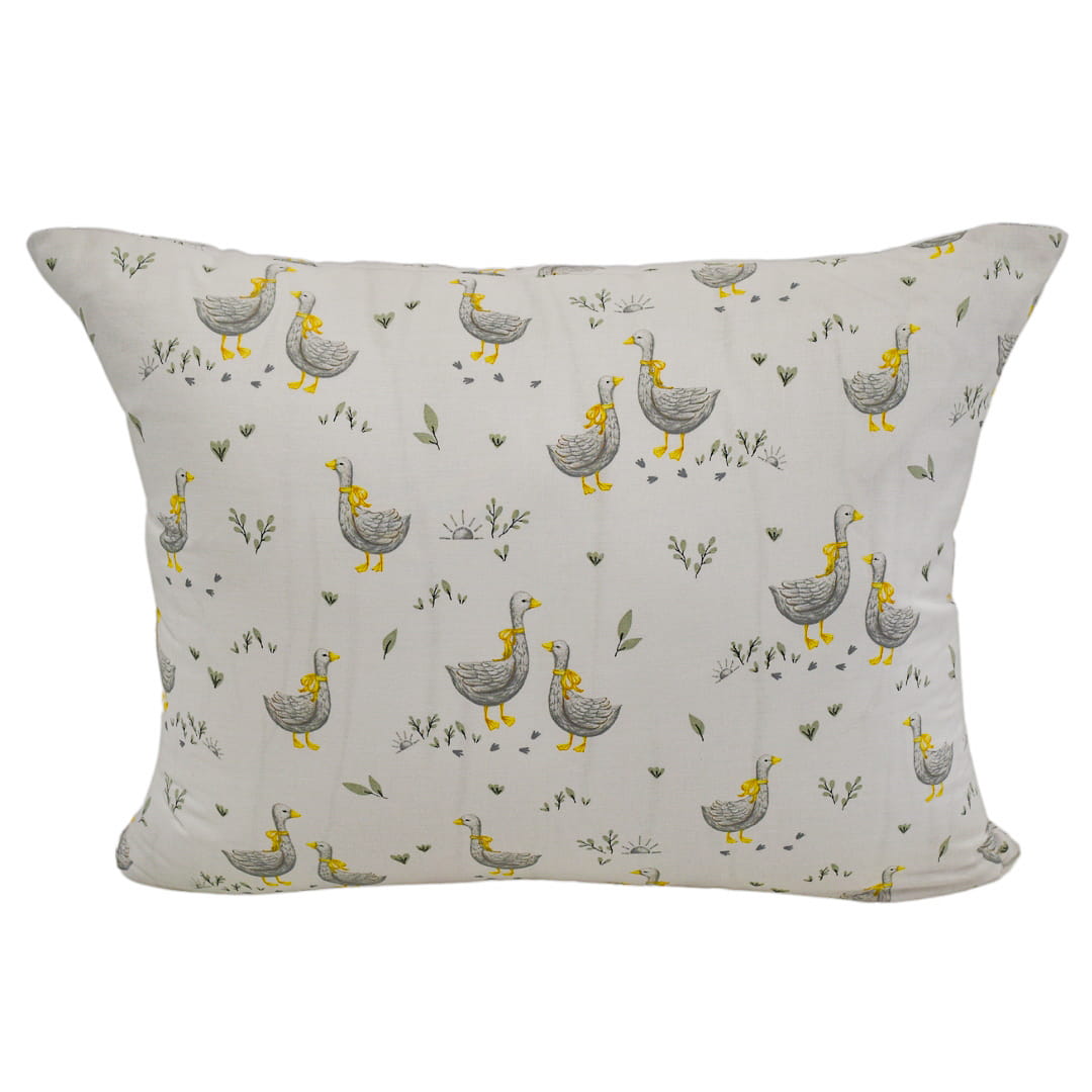 Komplet pościeli dziecięcej Gąski w rozmiarze 100x160 z poszewką w rozmiarze 70x80. Pościel dziecięca "Gąski" prezentuje uroczy i subtelny wzór, który wprowadza do dziecięcej sypialni wiejski klimat. Na białym tle znajdują się ilustracje gąsek w różnych pozach, ubrane w żółte kokardki na szyjach. Motyw gąsek jest przedstawiony w delikatnych odcieniach szarości i żółci, co nadaje całości harmonijny wygląd. Dodatkowym elementem dekoracyjnym są drobne gałązki i listki rozproszone po całej powierzchni, co tworzy lekką i przyjazną kompozycję. Ten wzór doskonale nadaje się dla dzieci, wprowadzając spokojny i sielski nastrój do pokoju.