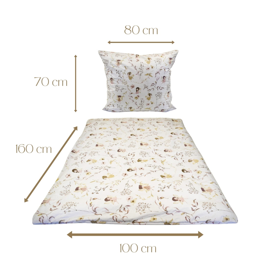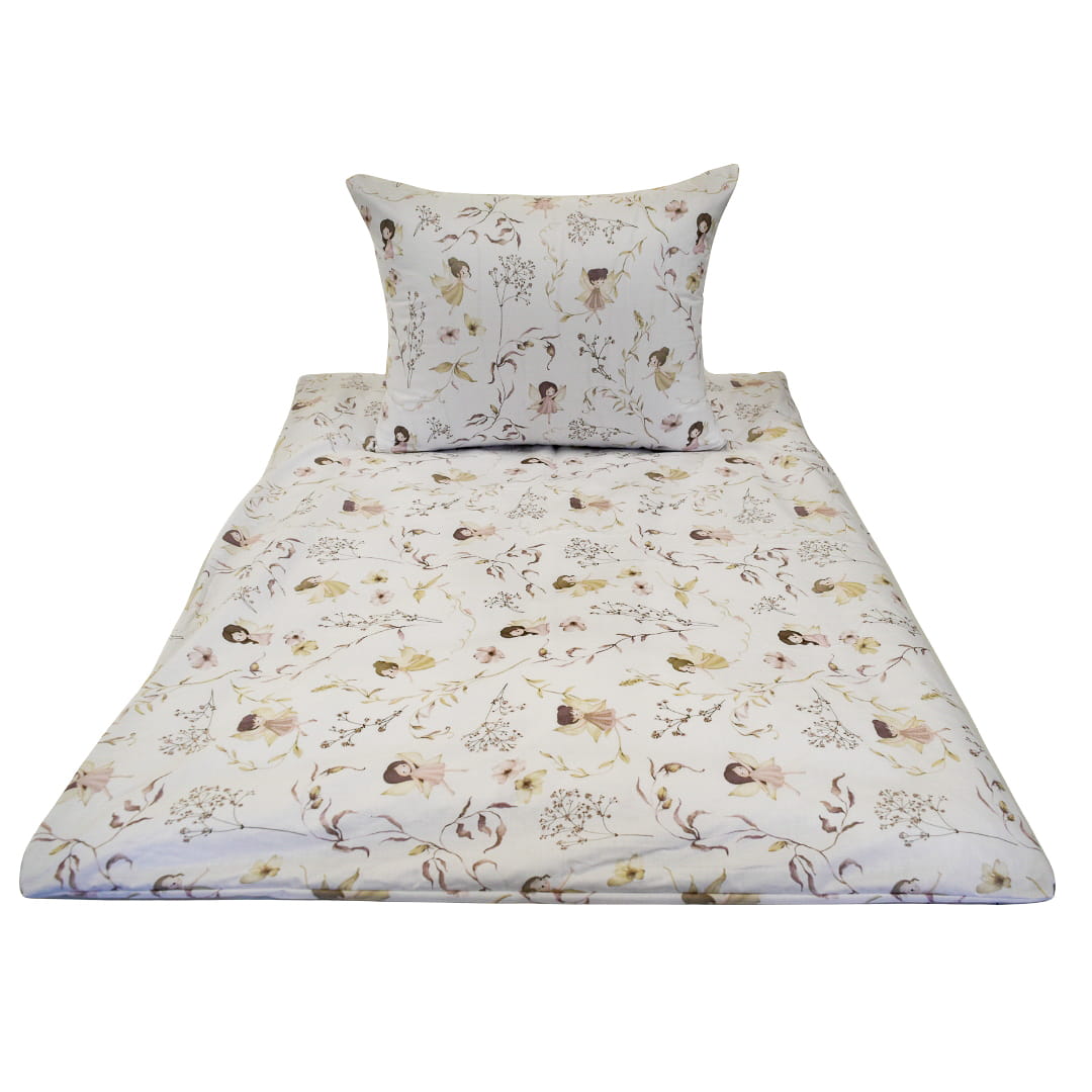 Komplet pościeli dziecięcej Wróżki Biel w rozmiarze 100x160 z poszewką w rozmiarze 70x80. Wzór pościeli „Wróżki Biel” jest delikatny i bajkowy, utrzymany w jasnej, białej kolorystyce. Na tle subtelnych gałązek i drobnych kwiatów rozmieszczone są ilustracje małych wróżek w pastelowych sukienkach. Całość tworzy lekki, dziewczęcy i spokojny motyw, idealny do dziecięcej sypialni, nadający jej przytulny i magiczny charakter.