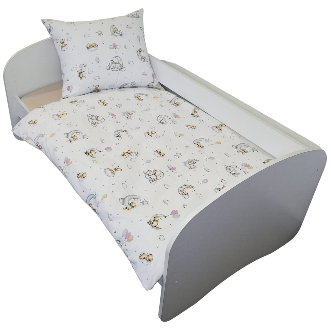 Kolorystyka wzoru opiera się na odcieniach szarości, beżu oraz delikatnych akcentach różu i żółci, co sprawia, że pościel jest idealna zarówno dla dziewczynek, jak i chłopców. To wzór stworzony z myślą o spokojnym i przytulnym śnie malucha.
