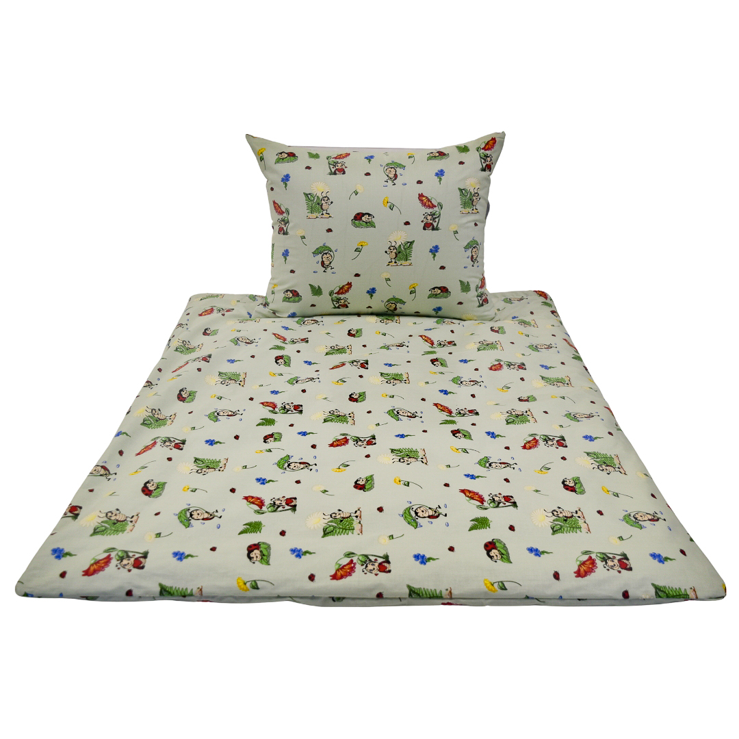 Komplet pościeli dziecięcej Biedronki Seledyn w rozmiarze 120x160 z poszewką w rozmiarze 50x70. Pościel dziecięca „Biedronki seledyn” ma jasne, seledynowe tło, które nadaje jej świeży i spokojny wygląd. Wzór tworzą urocze, bajkowe biedronki w różnych pozach, przeplatane kolorowymi kwiatkami i zielonymi listkami. Całość przypomina wesołą łąkę pełną drobnych, naturalnych motywów. Kolory są delikatne, ale żywe, dzięki czemu pościel wygląda radośnie i przyjaźnie dla dziecka.