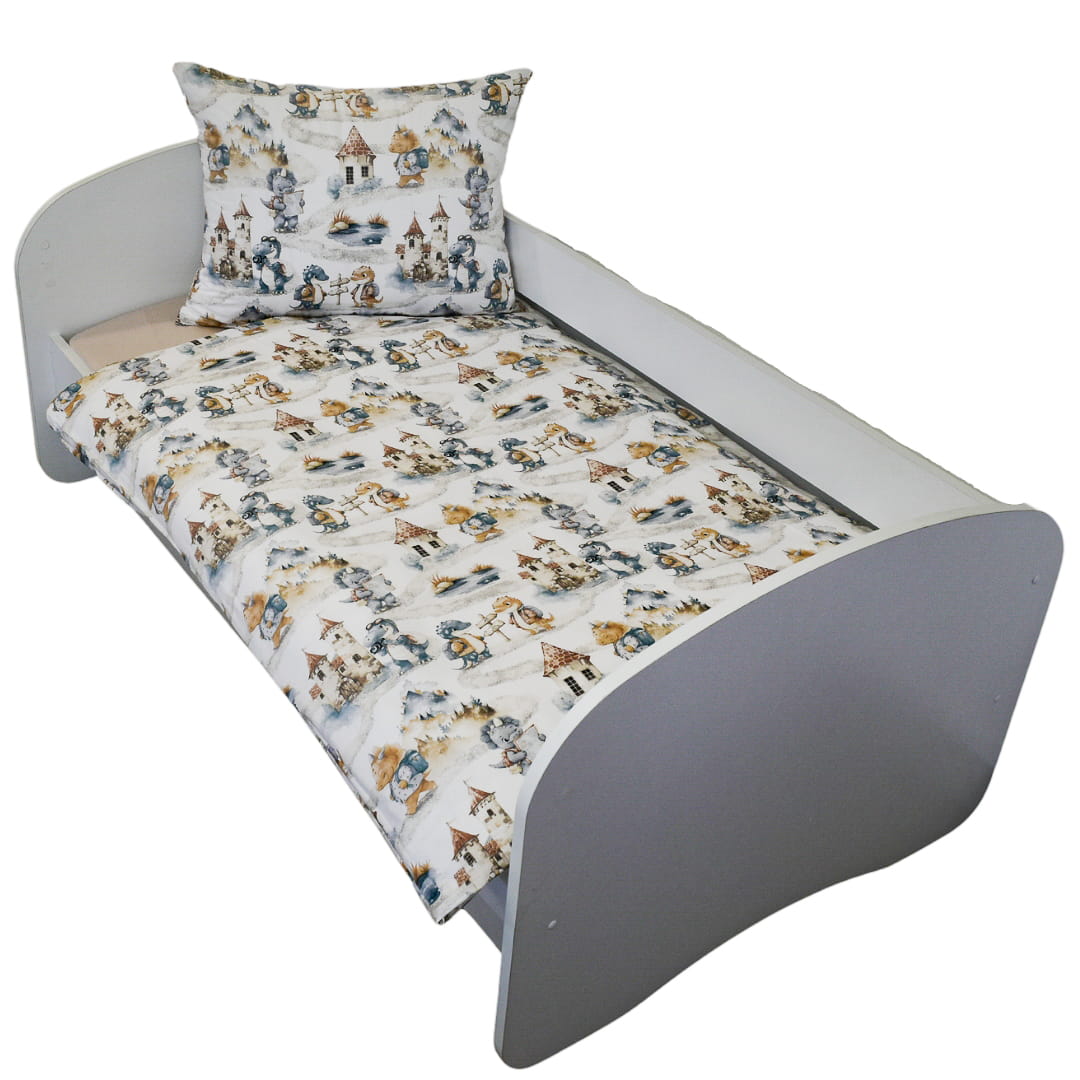 Komplet pościeli dziecięcej Dinusie Na Wyprawie w rozmiarze 120x160 z poszewką w rozmiarze 70x80. Pościel dziecięca "Dinusie na wyprawie" posiada wesoły, przygodowy wzór, idealny dla miłośników dinozaurów. Na jasnym tle przedstawiono urocze dinozaury w pastelowych odcieniach szarości, błękitu i musztardowej żółci, które wyruszyły na wyprawę. Dinozaury są przedstawione w różnych scenkach – trzymają mapy, noszą plecaki, rozmawiają i spacerują. W tle znajdują się elementy krajobrazu, takie jak zameczki z wieżyczkami, góry, drzewa i stawy, które tworzą bajkową, spokojną scenerię. Wzór jest bogaty w detale, ale jednocześnie utrzymany w łagodnych barwach, co sprawia, że pościel jest przyjemna dla oka i doskonale pasuje do dziecięcej sypialni w tematyce przygód lub dinozaurów.