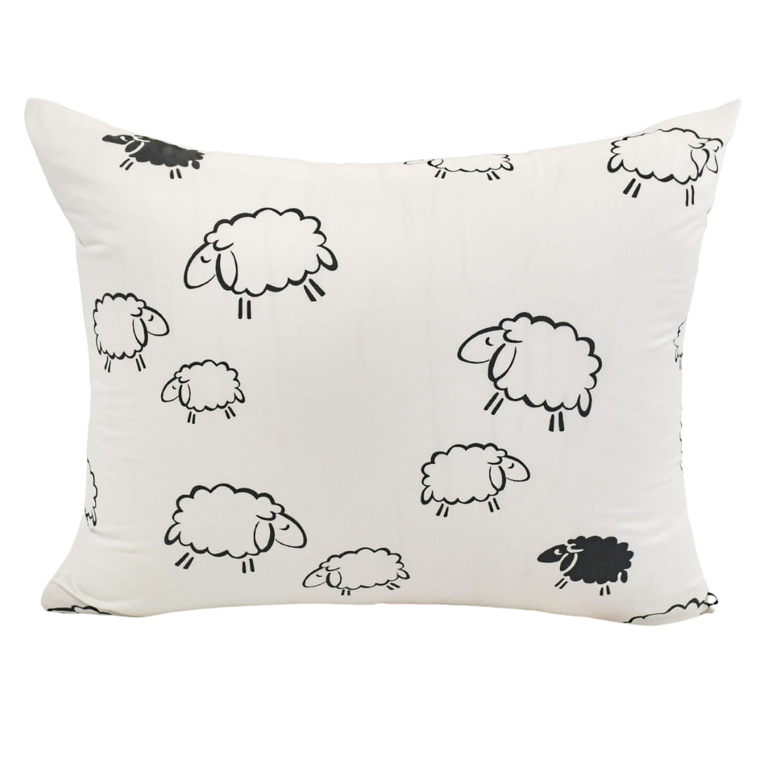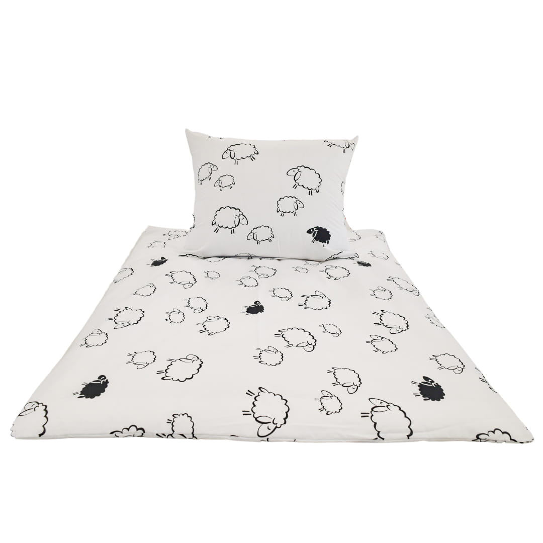 Komplet pościeli dziecięcej Owieczki Na Białym w rozmiarze 120x160 z poszewką w rozmiarze 70x80. Pościel dziecięca o nazwie "Owieczki Na Białym" ma elegancki, kontrastowy wzór. Całość utrzymana jest w bieli, na której znajdują się urocze, czarne kontury owieczek w różnych pozycjach – niektóre stoją, inne wyglądają na zrelaksowane. Styl rysunku owieczek jest minimalistyczny i kreskówkowy, co nadaje pościeli przyjazny i zabawny wygląd.