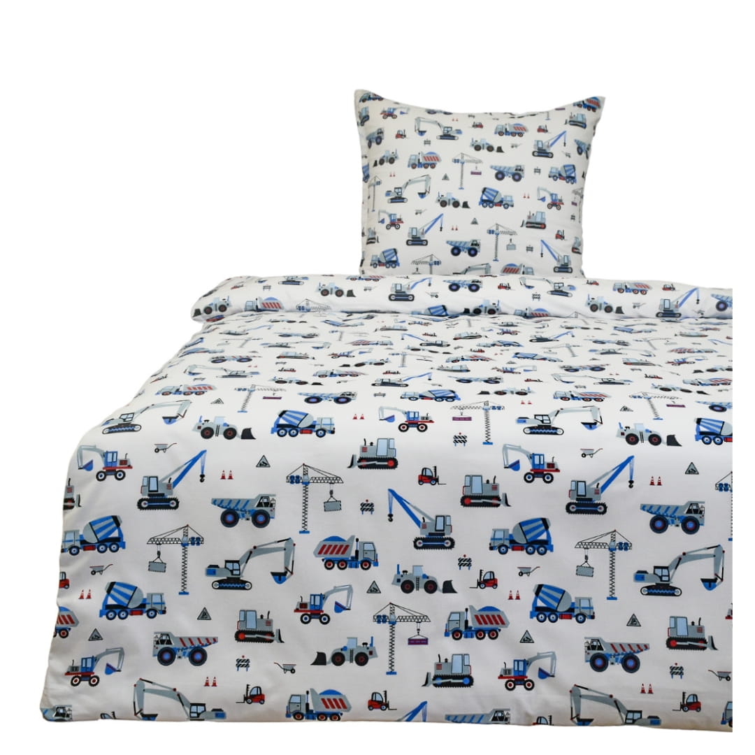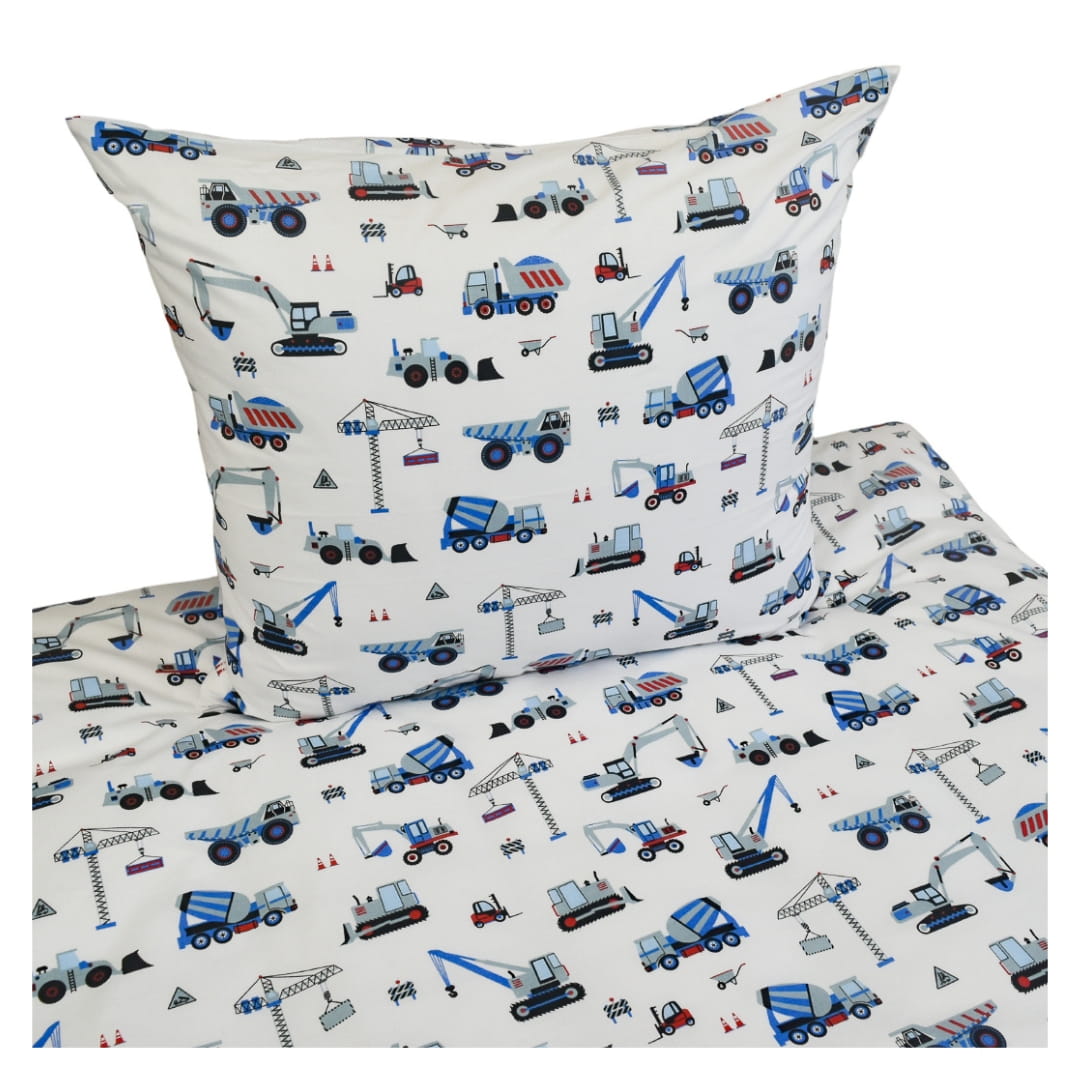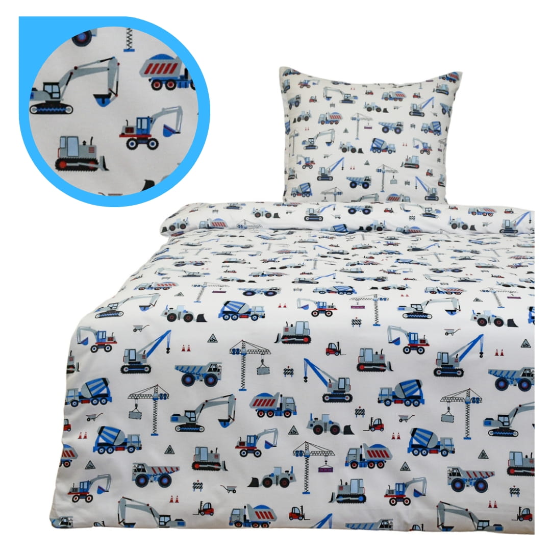 Komplet Pościeli Dziecięcej 140x200 + 1 x 50x70 Koparki Niebieskie Na Białym