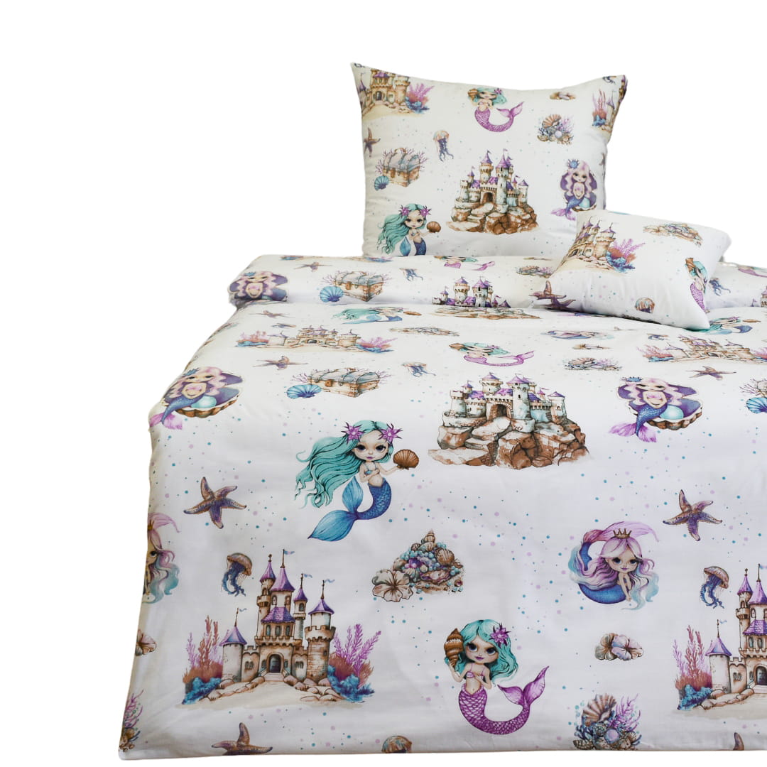 Komplet pościeli dziecięcej Syrenki w rozmiarze 140x200 z poszewką w rozmiarze 70x80. Pościel dziecięca Syrenki ma uroczy, bajkowy wzór inspirowany światem podwodnym. Na białym tle znajdują się kolorowe ilustracje syrenek o długich włosach w odcieniach turkusu i fioletu, które ozdobione są kwiatami we włosach. Syrenki są otoczone morskimi elementami, takimi jak rozgwiazdy, muszle, małe zamki z piasku, a także podwodne zamki, które przypominają bajkowe pałace. Kolory wzoru są żywe i delikatne, głównie turkusowe, fioletowe, różowe i beżowe, co nadaje całości przyjaznego i magicznego wyglądu, idealnego do pokoju dziecięcego.