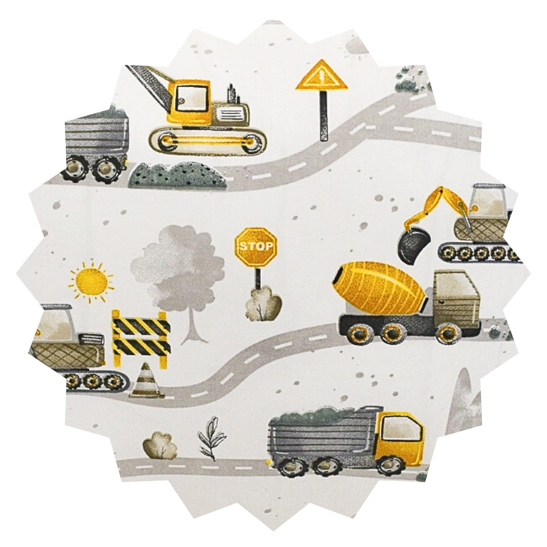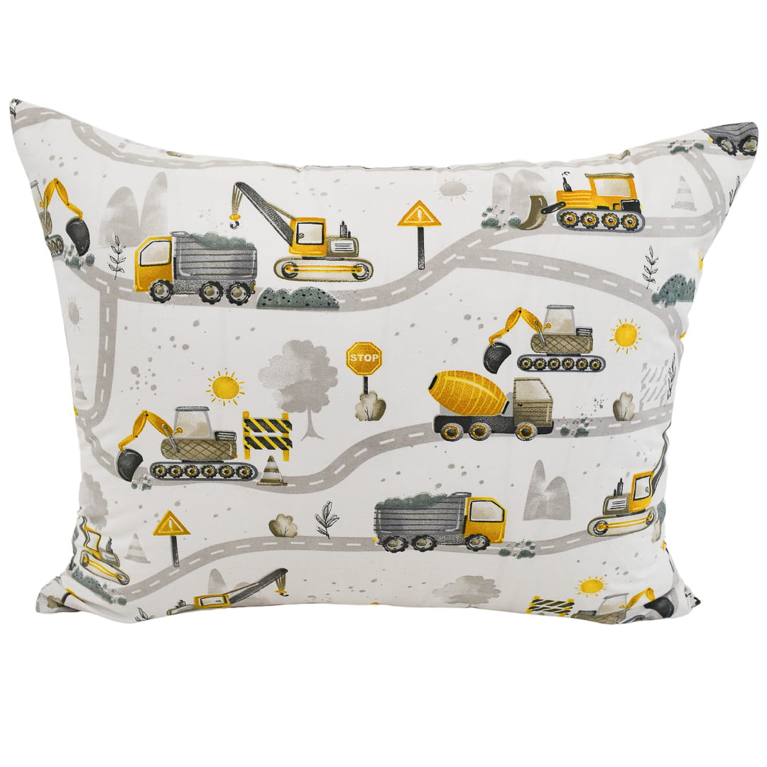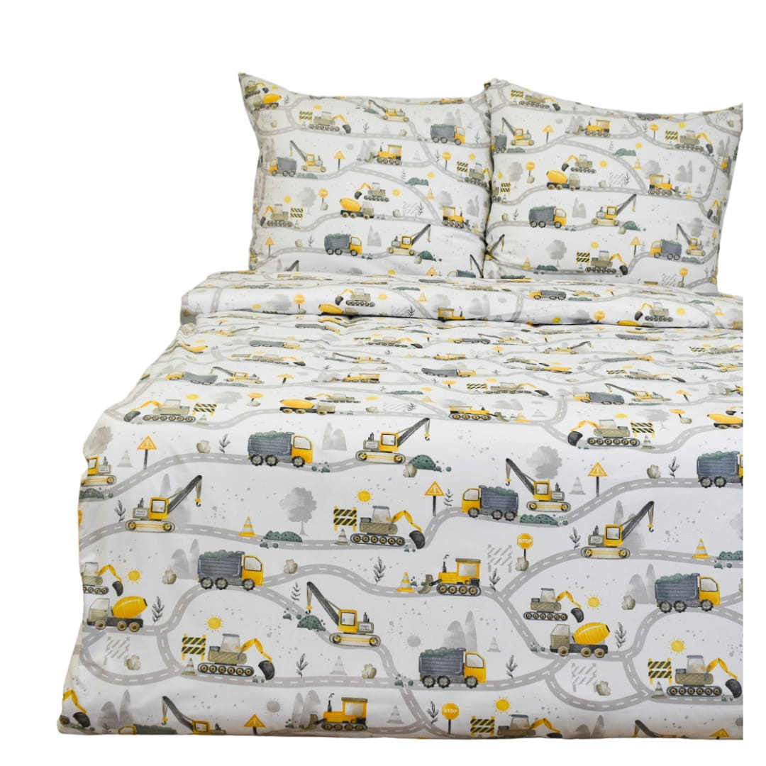 Komplet pościeli dziecięcej Koparki Żółte Nowe w rozmiarze 140x200 z poszewkami w rozmiarze 50x60. Pościel dziecięca "Koparki Żółte Nowe" posiada dynamiczny i tematyczny wzór, który z pewnością spodoba się małym miłośnikom pojazdów budowlanych. Na białym tle znajduje się sieć dróg, po których poruszają się żółte koparki, wywrotki, dźwigi i betoniarki. Pojazdy są przedstawione w realistycznym, ale jednocześnie przyjaznym stylu, co nadaje pościeli zabawowy charakter. Wzór uzupełniają elementy związane z budową, takie jak znaki drogowe, barierki, kopce ziemi, drzewa i krzewy, tworzące tło. Akcenty żółci i szarości nadają całości spójności, a jednocześnie przyciągają uwagę. Ta pościel idealnie nadaje się do pokoju dziecka zafascynowanego światem budowy i maszynami.