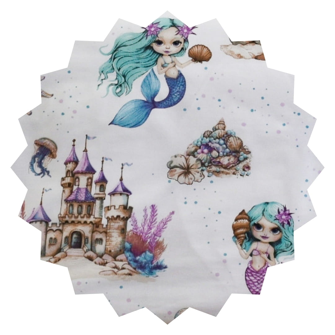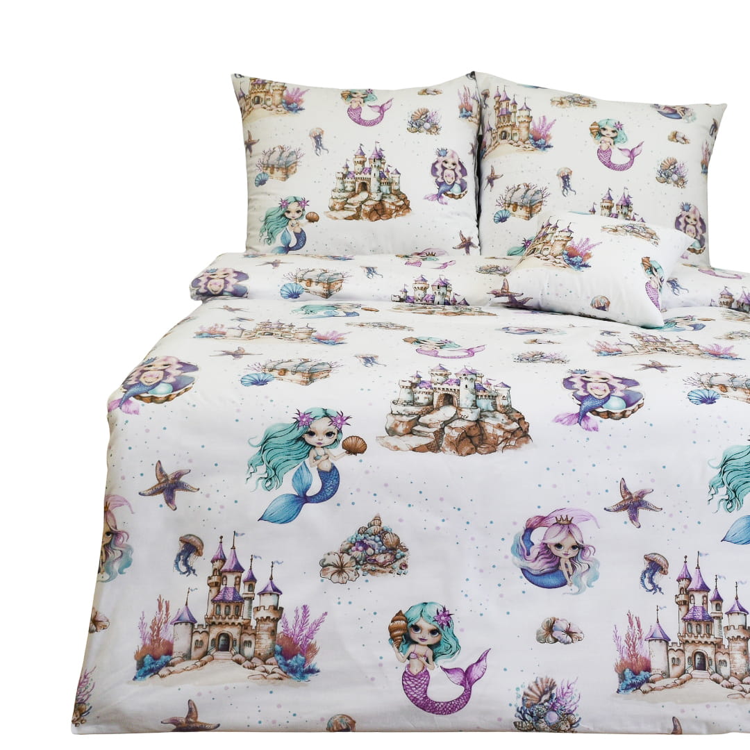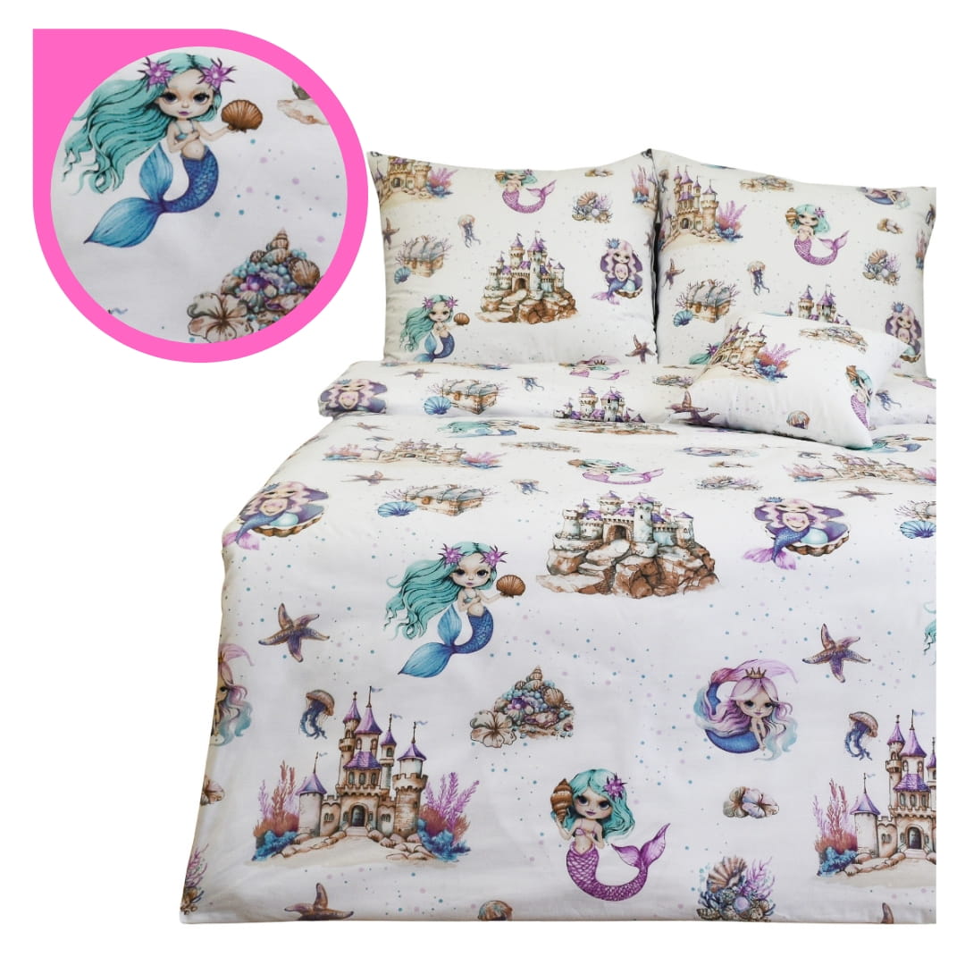 Komplet pościeli dziecięcej Syrenki w rozmiarze 140x200 z poszewkami w rozmiarze 50x70. Pościel dziecięca Syrenki ma uroczy, bajkowy wzór inspirowany światem podwodnym. Na białym tle znajdują się kolorowe ilustracje syrenek o długich włosach w odcieniach turkusu i fioletu, które ozdobione są kwiatami we włosach. Syrenki są otoczone morskimi elementami, takimi jak rozgwiazdy, muszle, małe zamki z piasku, a także podwodne zamki, które przypominają bajkowe pałace. Kolory wzoru są żywe i delikatne, głównie turkusowe, fioletowe, różowe i beżowe, co nadaje całości przyjaznego i magicznego wyglądu, idealnego do pokoju dziecięcego.