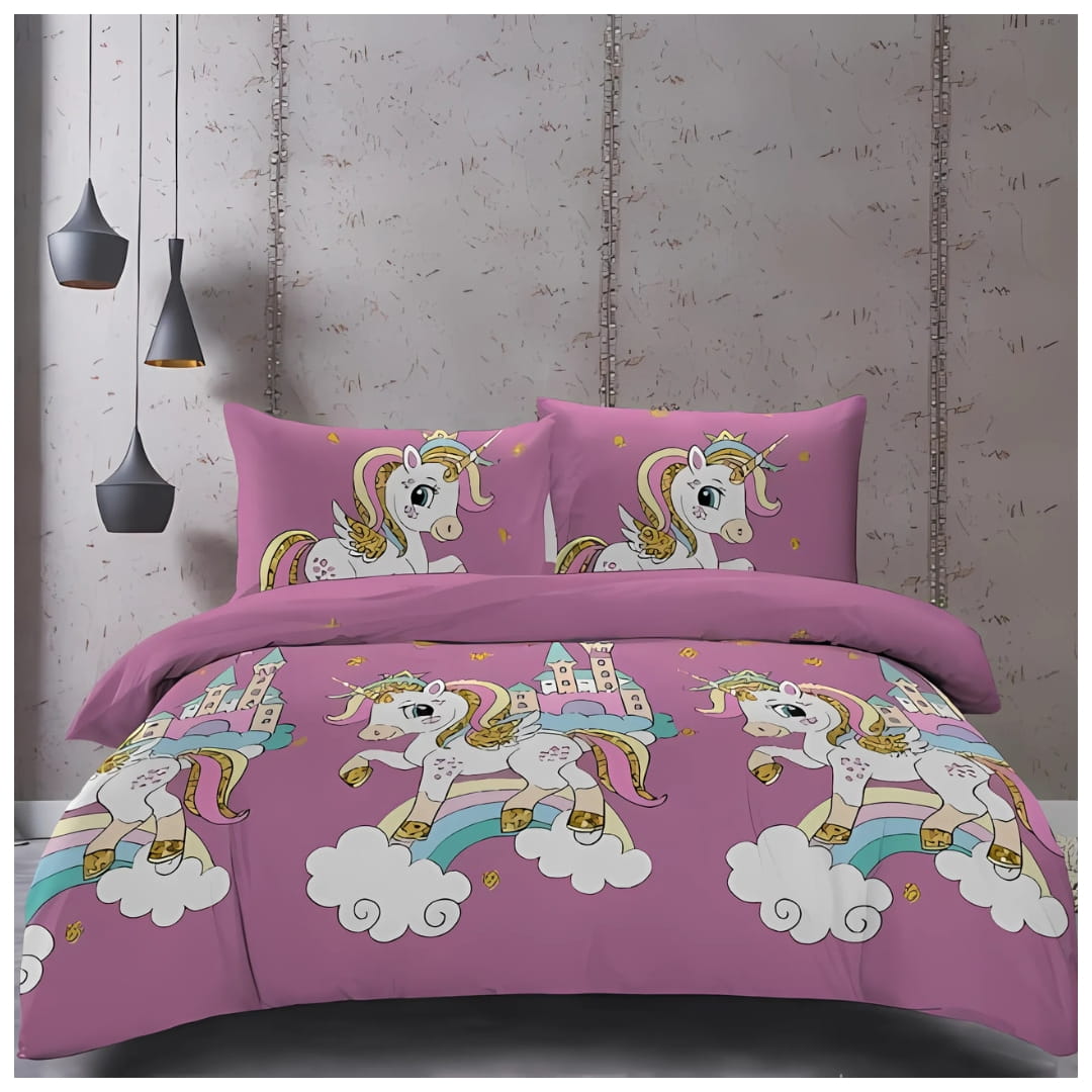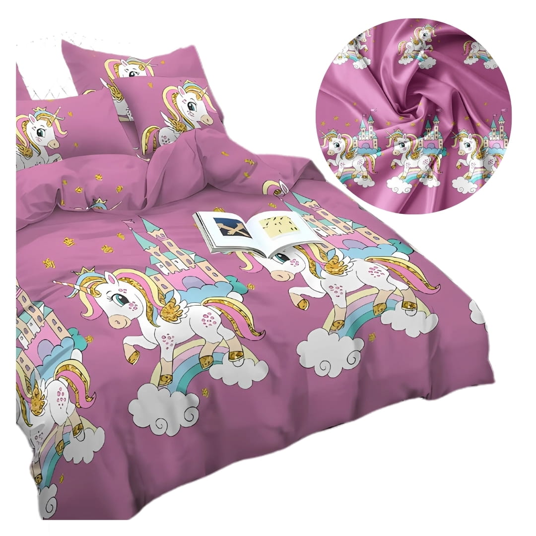 Komplet Pościeli Dziecięcej 3D 140x200 + 1x70/80 Unicorn Fiolet Satyna Bawełniana 2417