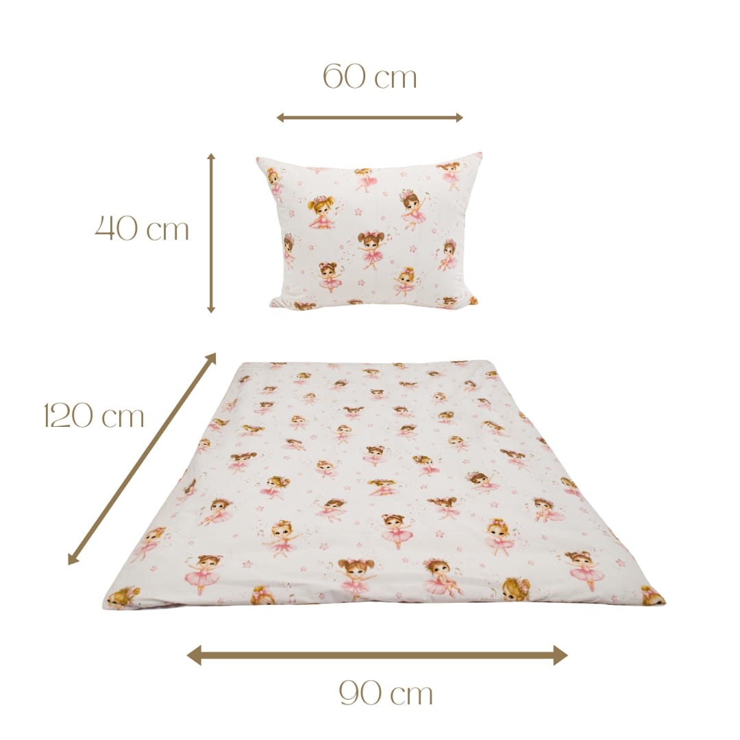 Komplet pościeli dziecięcej Baletnice Róż w rozmiarze 90x120 z poszewką w rozmiarze 40x60. Pościel dziecięca "Baletnice Róż" to uroczy i dziewczęcy zestaw, który przeniesie każdą małą miłośniczkę tańca do magicznego świata baletu. Wykonana z jasnej, kremowej tkaniny, ozdobiona jest delikatnym wzorem przedstawiającym słodkie baletnice w różnych tanecznych pozach.