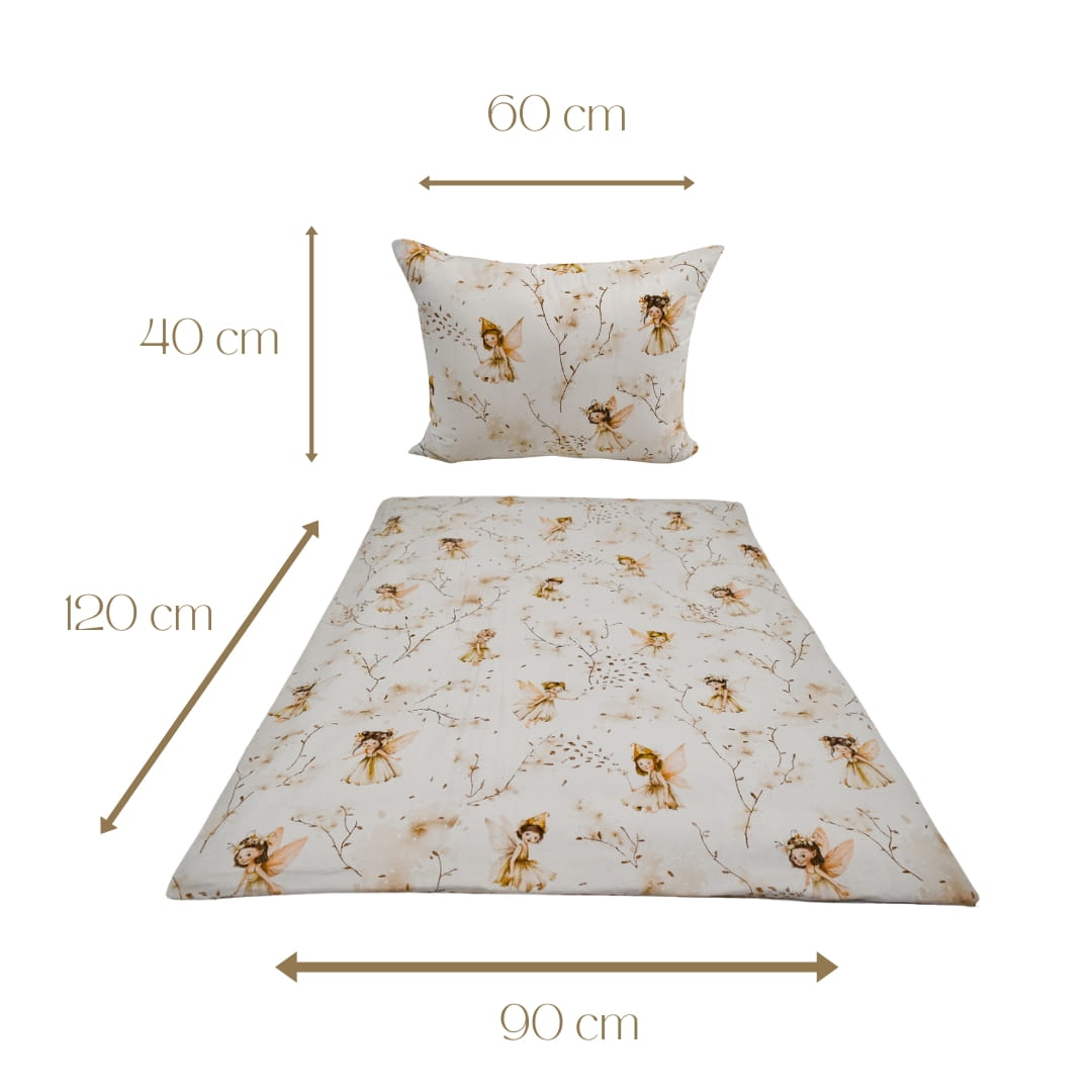 Komplet pościeli dziecięcej Calineczka Beż w rozmiarze 90x120 z poszewką w rozmiarze 40x60 Pościel dziecięca "Calineczka beż" ma delikatny, bajkowy wzór idealny do pokoju malucha. Na kremowo-beżowym tle znajdują się subtelne ilustracje maleńkich wróżek lub Calineczek w pastelowych, beżowych sukienkach. Postacie mają skrzydełka, korony z kwiatów i rozwiane włosy – każda wygląda jak z zaczarowanego lasu. Wokół nich są cienkie gałązki, listki i drobne roślinki, które nadają wzorowi lekkości i naturalnego uroku.
