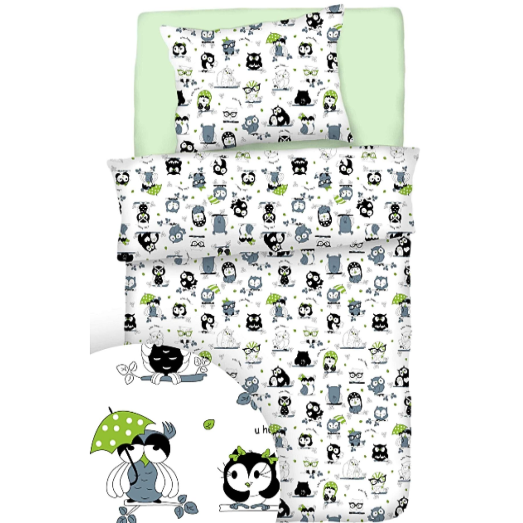 Komplet Pościeli Dziecięcej 90x120 + 50x60 Szalone Sowy Zielone Na Białym