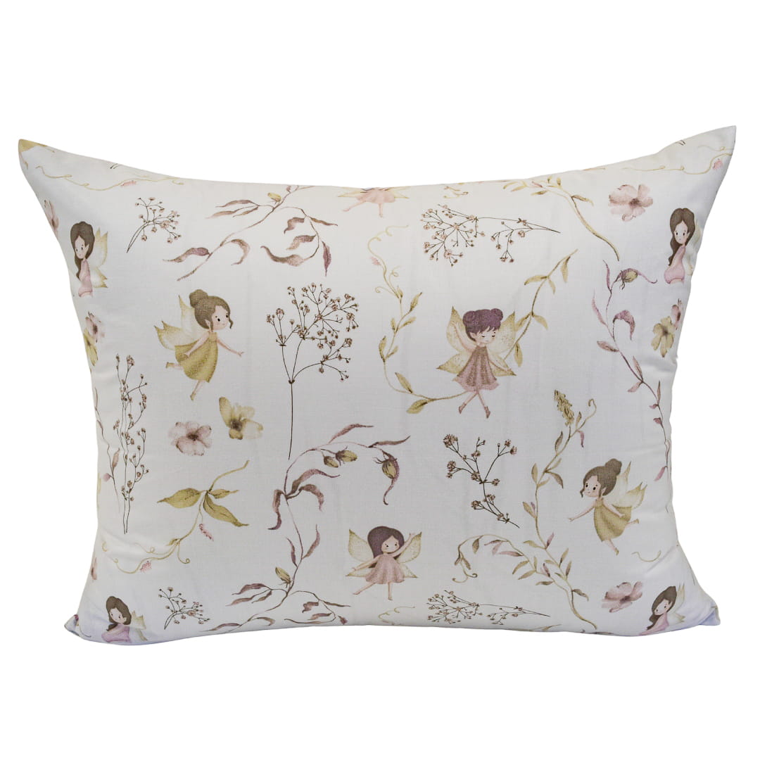 Komplet pościeli dziecięcej Wróżki Biel w rozmiarze 90x120 z poszewką w rozmiarze 50x60. Wzór pościeli „Wróżki Biel” jest delikatny i bajkowy, utrzymany w jasnej, białej kolorystyce. Na tle subtelnych gałązek i drobnych kwiatów rozmieszczone są ilustracje małych wróżek w pastelowych sukienkach. Całość tworzy lekki, dziewczęcy i spokojny motyw, idealny do dziecięcej sypialni, nadający jej przytulny i magiczny charakter.