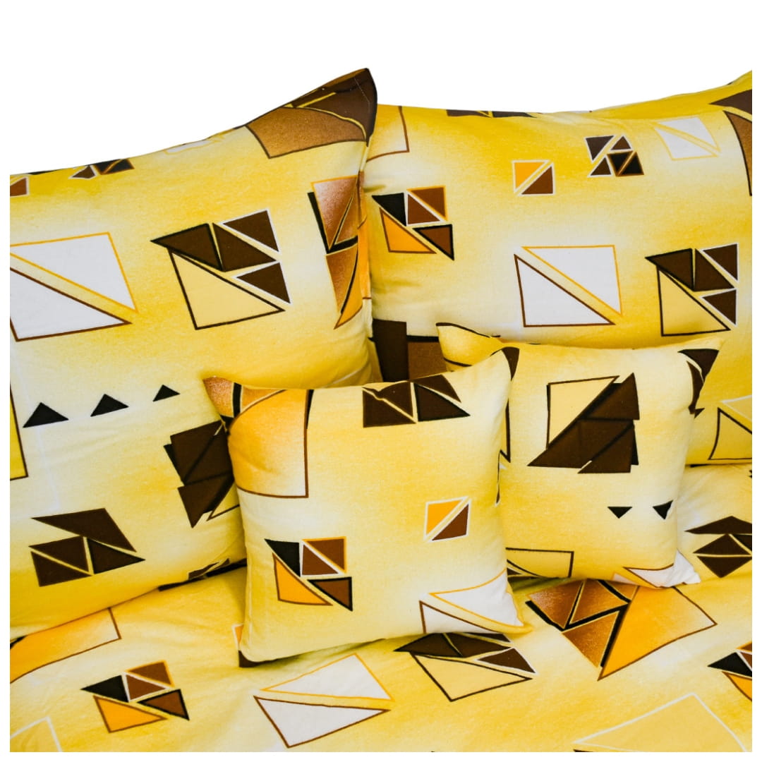 Kolorystyka wzoru opiera się na brązach, czerni, beżach oraz bieli, które kontrastują z żółtym tłem, ale nie są ostre – całość pozostaje harmonijna i przyjemna dla oka. Cienkie linie i ostre krawędzie figur podkreślają geometryczny styl, a jednocześnie nadają pościeli elegancki, lekko designerski wygląd.