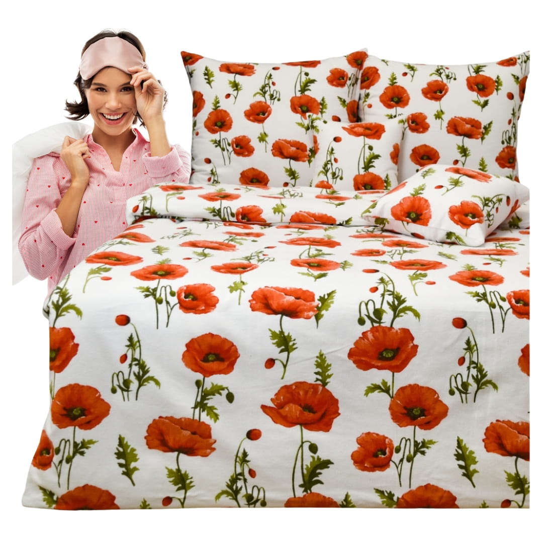 Komplet Pościeli Flanelowej 160x200 2x70/80 Maki Na Białym