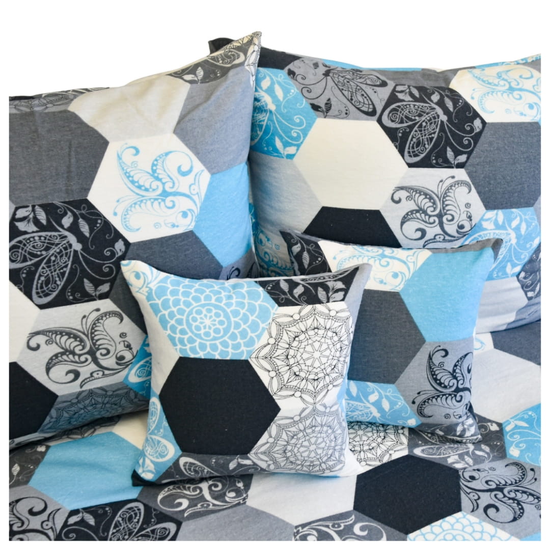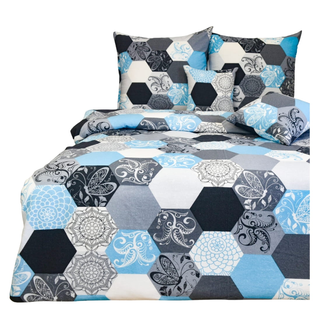 Komplet pościeli flanelowej Plastry Miodu Niebieskie w rozmiarze 160x200. Pościel flanelowa „Plastry Miodu Niebieskie” wyróżnia się ciekawym, geometrycznym wzorem zbudowanym z heksagonów (sześciokątów) przypominających plastry miodu. Wzory wewnątrz heksagonów są zróżnicowane – jedne są jednobarwne, inne zdobione motywami kwiatowymi, paisley oraz delikatnymi ornamentami przypominającymi koronki.