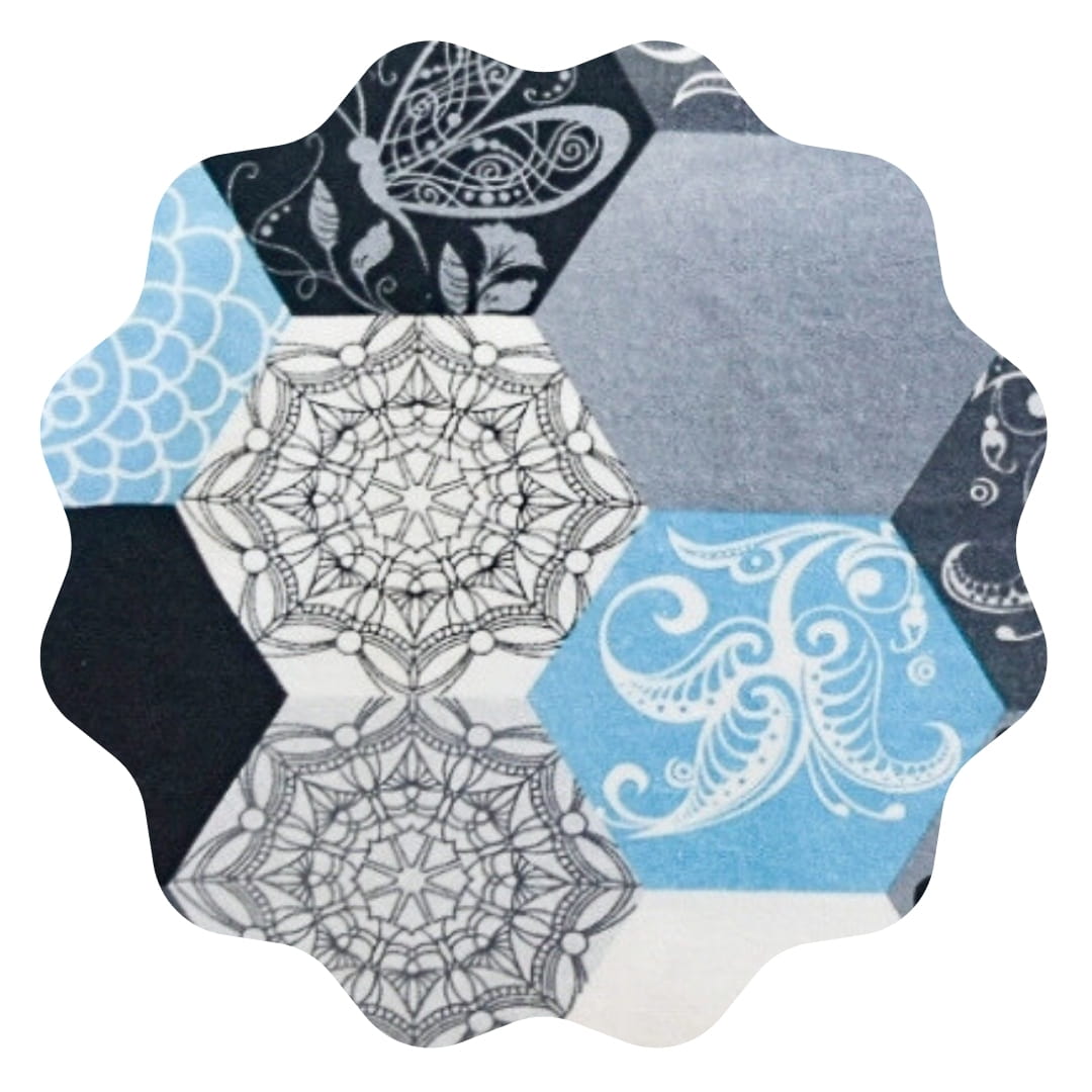Dominują chłodne, harmonijne barwy: odcienie niebieskiego, szarości, bieli i czerni, które tworzą spokojną, ale elegancką kompozycję. Kontrast między jasnymi i ciemnymi elementami nadaje całości głębi, a różnorodność wzorów w każdym heksagonie wprowadza dynamikę.