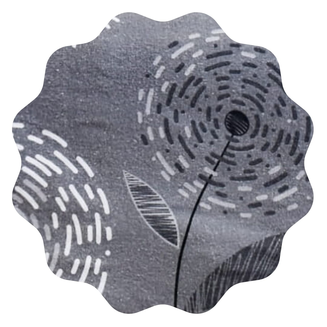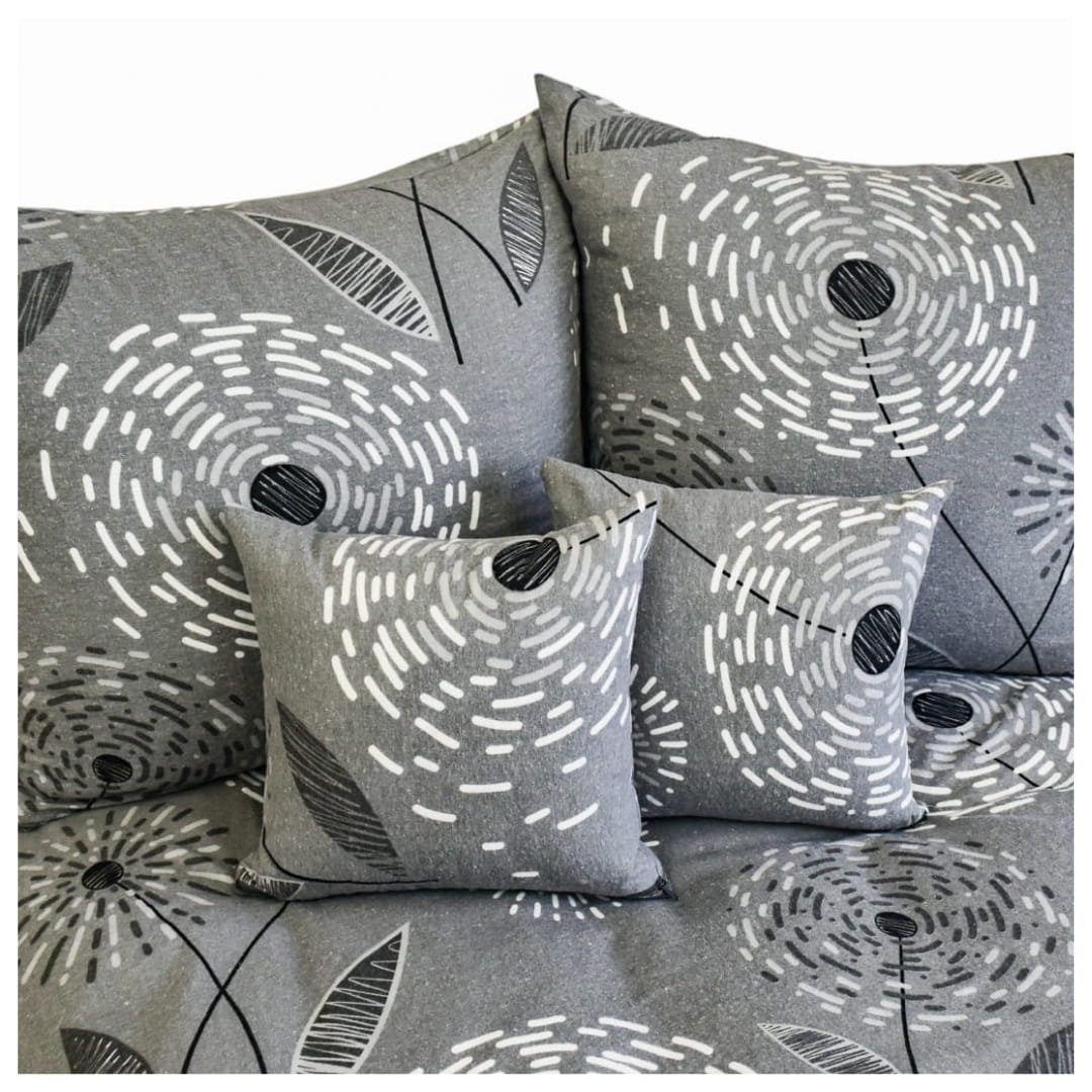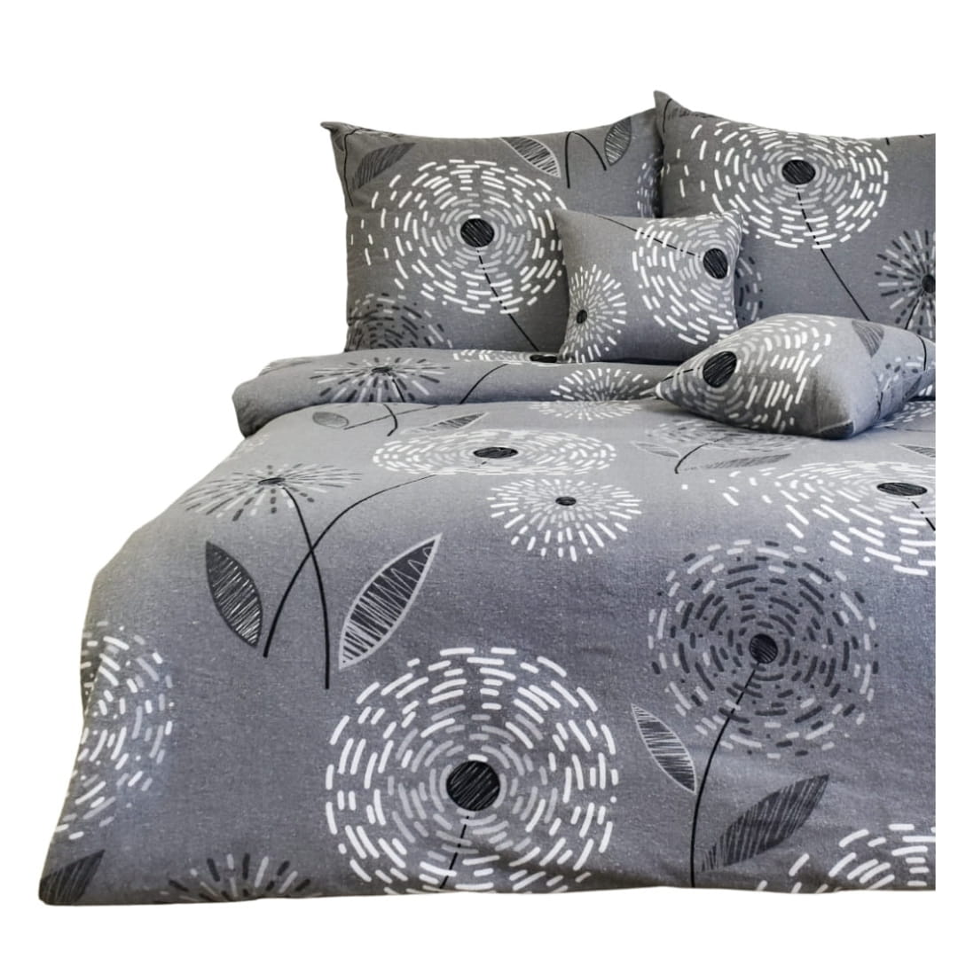 Komplet pościeli flanelowej Dmuchawce w rozmiarze 160x200. Komplet pościeli flanelowej "Dmuchawce" charakteryzuje się nowoczesnym wzorem przedstawiającym stylizowane dmuchawce na szarym tle. Kwiaty są ukazane w delikatnych odcieniach bieli i czerni, z geometrycznymi akcentami, co nadaje całości elegancki, a jednocześnie minimalistyczny wygląd. Wzór rozmieszczony jest równomiernie na powierzchni pościeli, tworząc subtelny, uspokajający efekt.