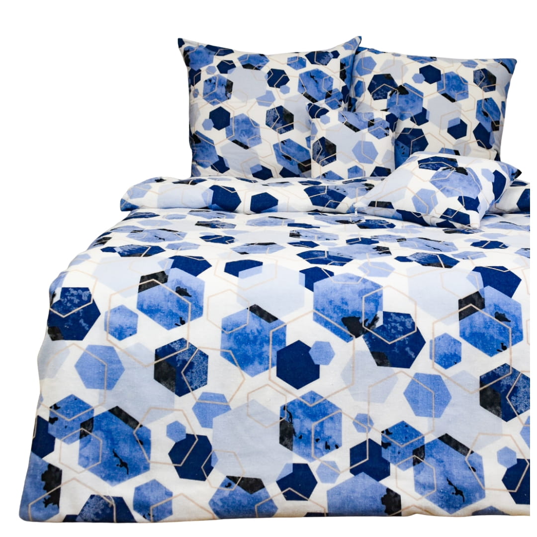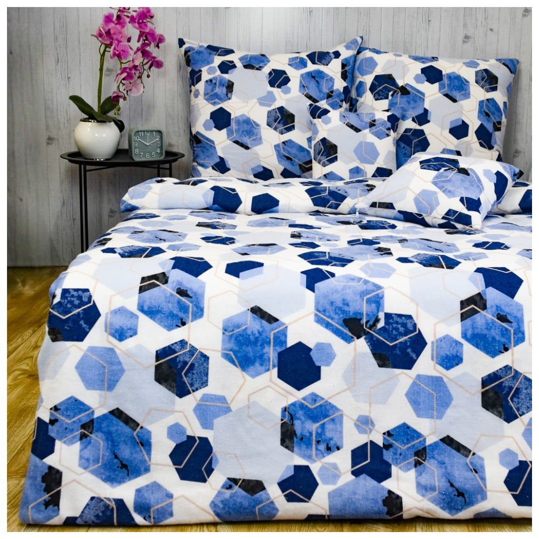 Komplet pościeli flanelowej o nazwie "Geometryczny Niebieski". Wzór pościeli to nowoczesna, geometryczna kompozycja złożona z sześciokątów (heksagonów) w różnych odcieniach niebieskiego, granatu i czerni. Część z nich wypełniona jest gradientowymi plamami lub teksturą przypominającą akwarelę, inne są puste lub mają kontury w jasnym beżu. Heksagony nakładają się na siebie i są rozmieszczone nieregularnie, tworząc efekt głębi i przestrzenności. Całość umieszczona jest na białym tle, co podkreśla kontrast i nadaje wzorowi świeży, dynamiczny wygląd. Pościel sprawia wrażenie nowoczesnej, chłodnej i stylowej – idealna do minimalistycznych lub industrialnych wnętrz.