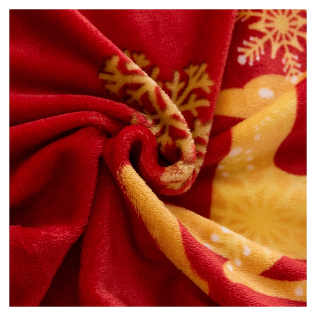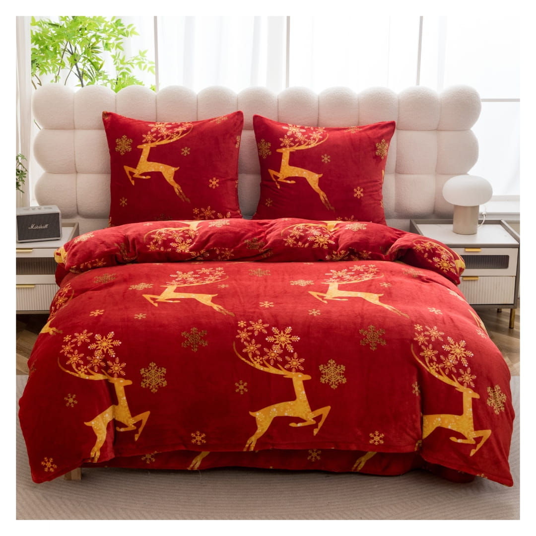 Komplet ciepłej pościeli świątecznej polarowej w rozmiarze 160x200. Pościel świąteczna „Złote Renifery” to elegancka i efektowna propozycja na zimowe miesiące, która od razu przywodzi na myśl magiczny klimat Bożego Narodzenia. Wzór jest duży i rozproszony – nie powtarza się w drobnych pasach jak w klasycznych sweterkowych wzorach, ale bardziej przypomina artystyczną kompozycję, nadając pościeli bardziej nowoczesny i ekskluzywny charakter.