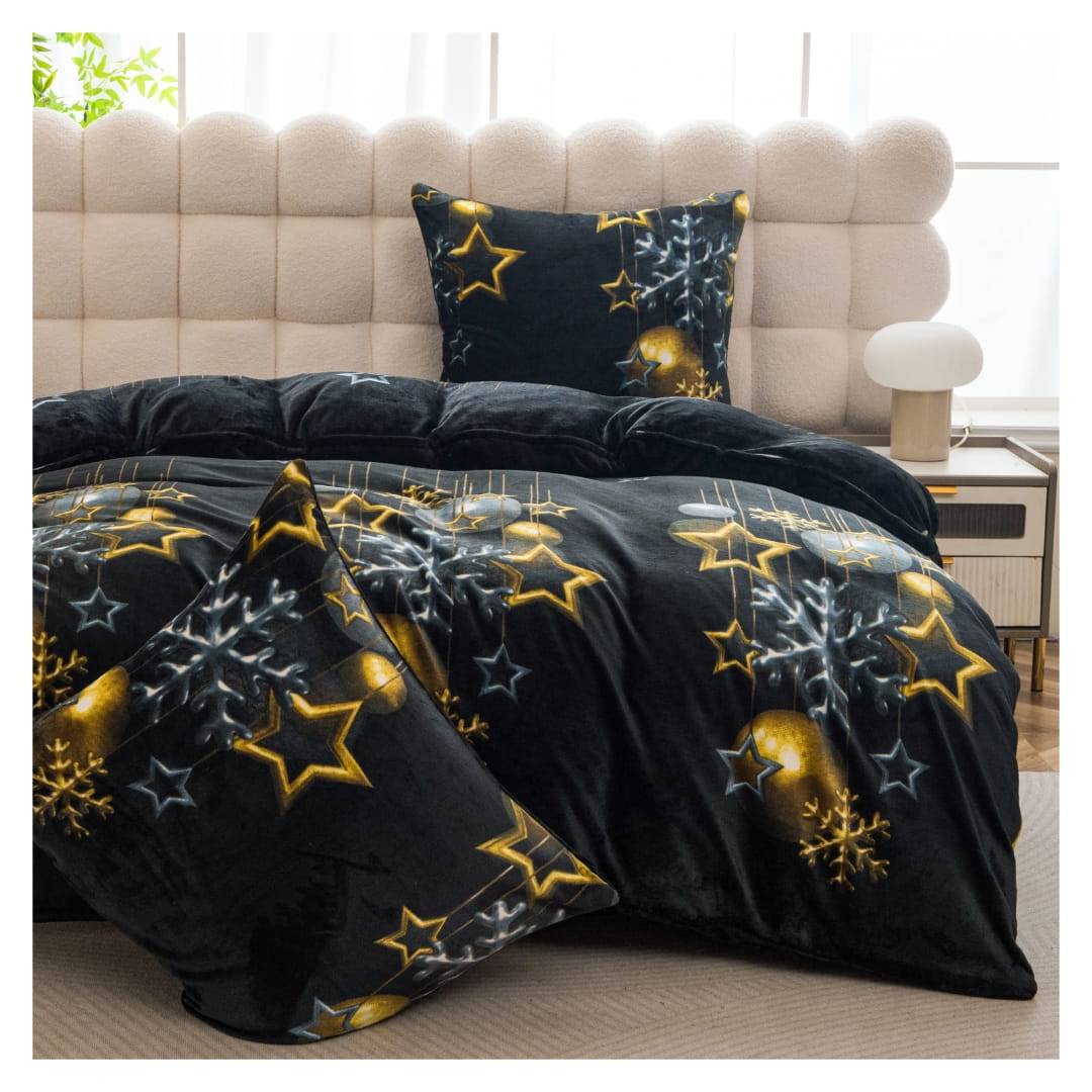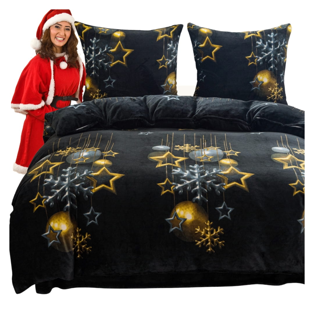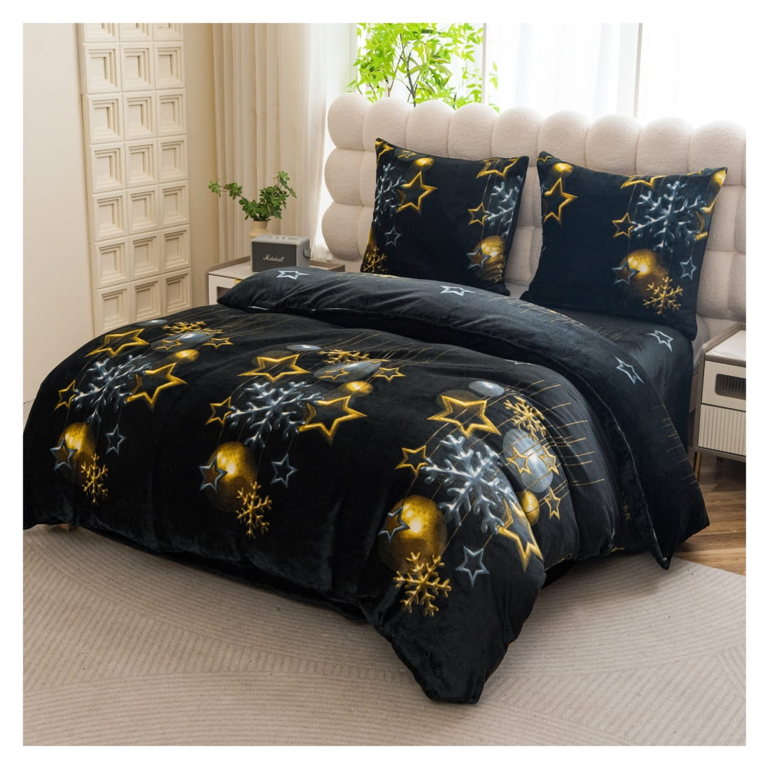 Komplet ciepłej pościeli świątecznej polarowej w rozmiarze 220x200. Wzór pościeli przedstawia zawieszone świąteczne ozdoby w eleganckim stylu. Na ciemnym, niemal czarnym tle znajdują się złote i srebrne elementy takie jak: gwiazdy w różnych rozmiarach, zarówno pełne, jak i z konturem, śnieżynki w złotych i srebrnych tonacjach, bombki o lśniącym wyglądzie oraz cienkie złote linie, z których ozdoby „zwisają” niczym dekoracje choinkowe. Wzór ma symetryczny układ, co nadaje całości nowoczesnego, a zarazem przytulnego, świątecznego charakteru. Idealnie pasuje na zimowe miesiące i bożonarodzeniowy klimat.