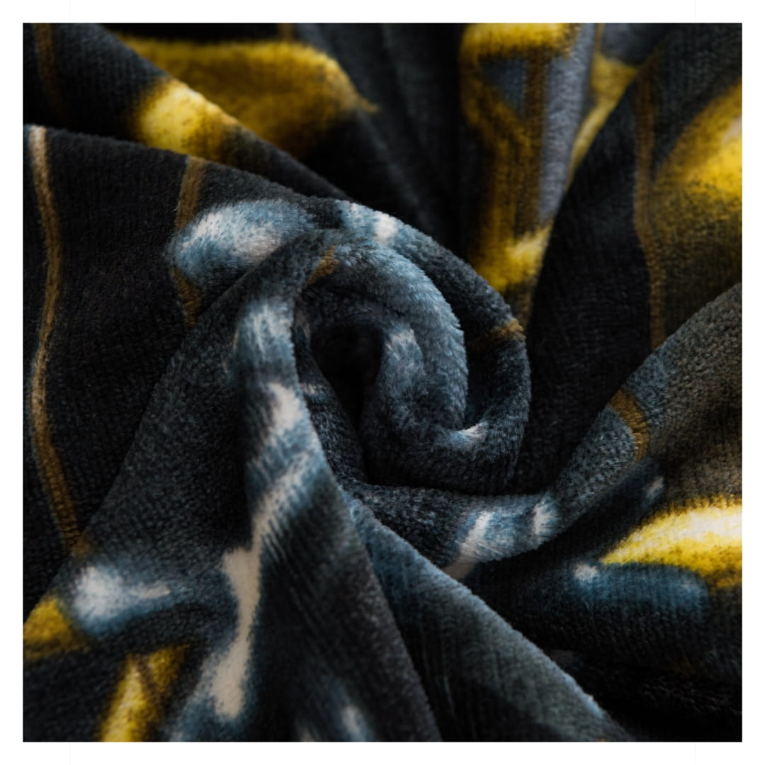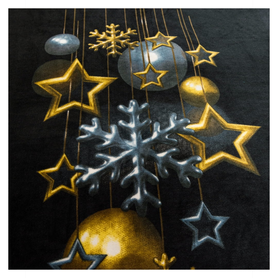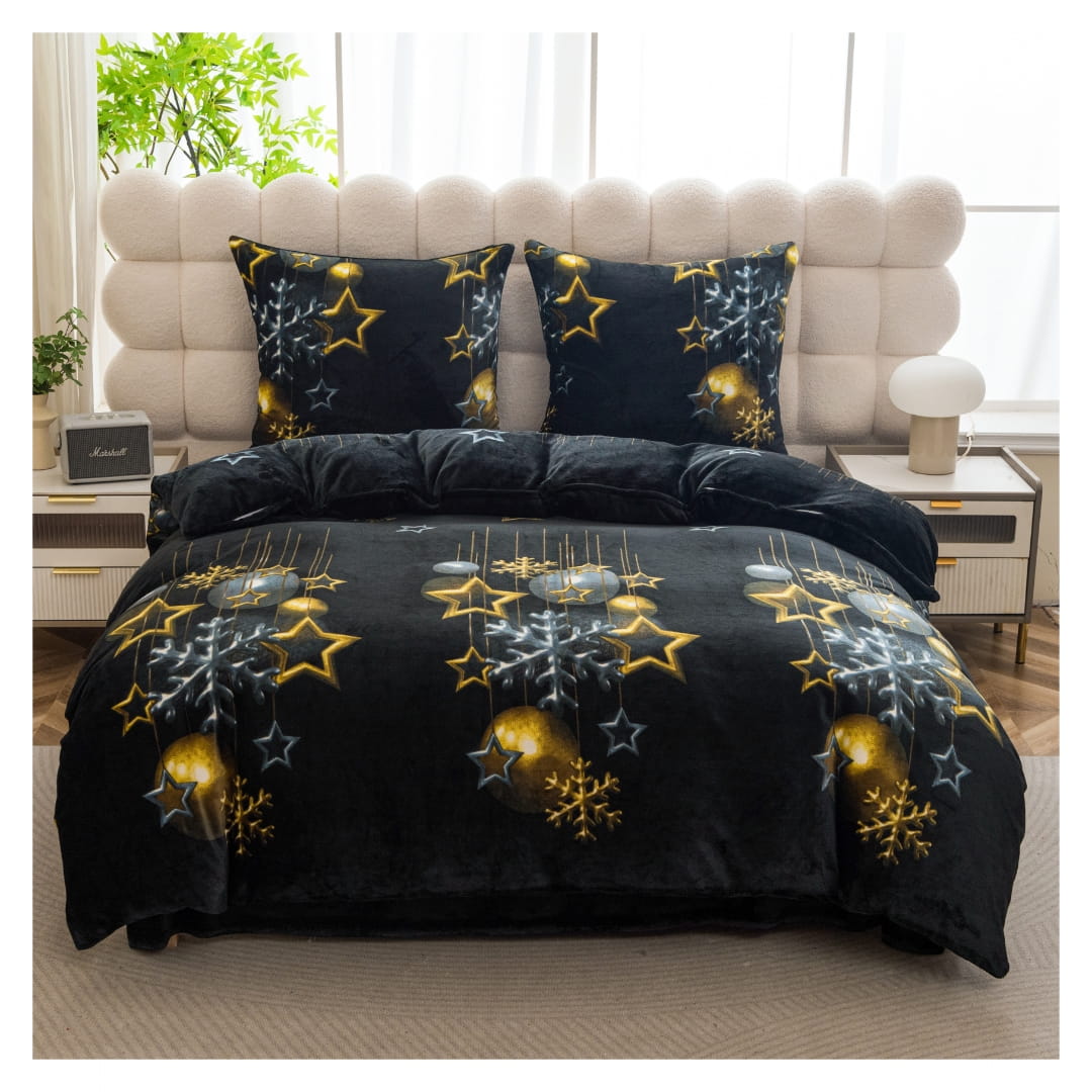 Komplet ciepłej pościeli świątecznej polarowej w rozmiarze 220x200. Wzór pościeli przedstawia zawieszone świąteczne ozdoby w eleganckim stylu. Na ciemnym, niemal czarnym tle znajdują się złote i srebrne elementy takie jak: gwiazdy w różnych rozmiarach, zarówno pełne, jak i z konturem, śnieżynki w złotych i srebrnych tonacjach, bombki o lśniącym wyglądzie oraz cienkie złote linie, z których ozdoby „zwisają” niczym dekoracje choinkowe. Wzór ma symetryczny układ, co nadaje całości nowoczesnego, a zarazem przytulnego, świątecznego charakteru. Idealnie pasuje na zimowe miesiące i bożonarodzeniowy klimat.