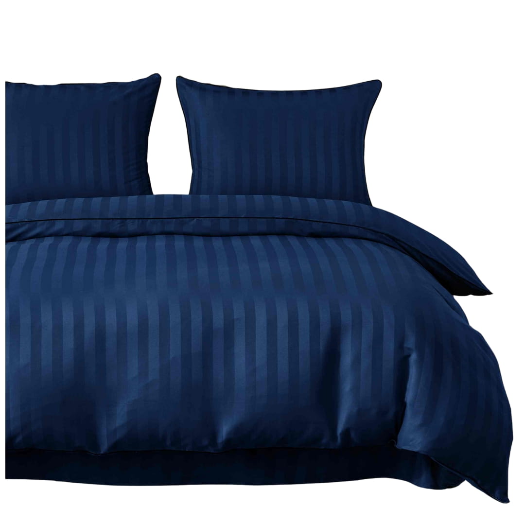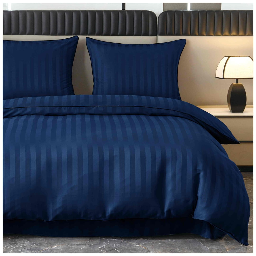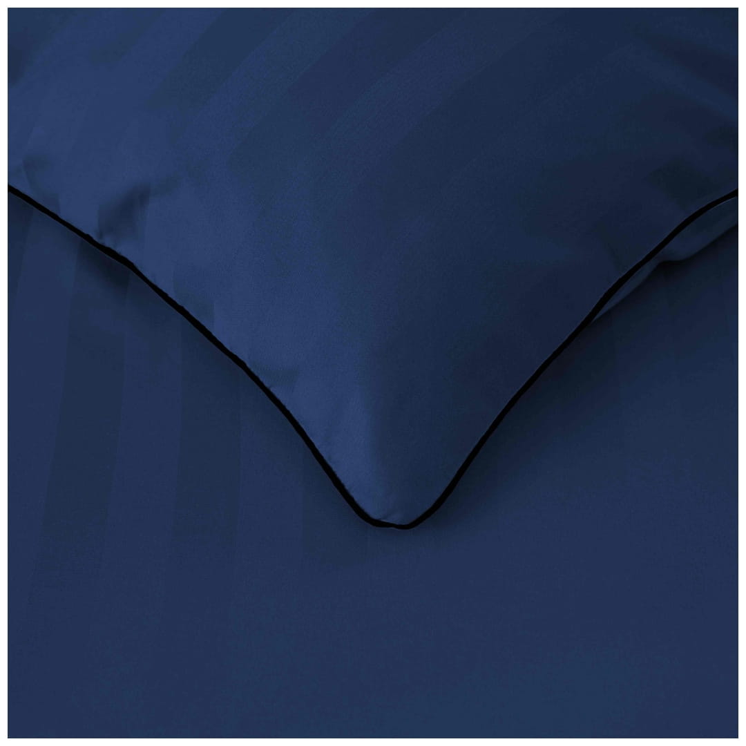 Pościel z lamówką w rozmiarze 140x200 wykonana jest z mikrowłókna bawełnianego. Materiał przypomina czystą bawełnę, dzięki czemu posiada lekki połysk. Materiał jest miękki i przyjazny dla skóry. Delikatne pasy w stylu satynowego żakardu – tworzą efekt subtelnych prążków, które dodają głębi i wyrafinowania. Całość została ozdobiona lamówką w kontrastowym odcieniu, która elegancko podkreśla krawędzie poduszek i kołdry. Nowoczesny, minimalistyczny, idealny do sypialni w stylu hotelowym, glamour lub klasycznym. Ten komplet pościeli sprawia wrażenie ekskluzywnego, doskonale komponuje się z ciemnym zagłówkiem łóżka i marmurową podłogą, tworząc spójną, elegancką aranżację sypialni.