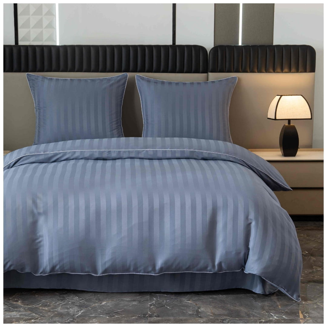 Pościel z lamówką w rozmiarze 140x200 wykonana jest z mikrowłókna bawełnianego. Materiał przypomina czystą bawełnę, dzięki czemu posiada lekki połysk. Materiał jest miękki i przyjazny dla skóry. Delikatne pasy w stylu satynowego żakardu – tworzą efekt subtelnych prążków, które dodają głębi i wyrafinowania. Całość została ozdobiona lamówką w kontrastowym odcieniu, która elegancko podkreśla krawędzie poduszek i kołdry. Nowoczesny, minimalistyczny, idealny do sypialni w stylu hotelowym, glamour lub klasycznym. Ten komplet pościeli sprawia wrażenie ekskluzywnego, doskonale komponuje się z ciemnym zagłówkiem łóżka i marmurową podłogą, tworząc spójną, elegancką aranżację sypialni.