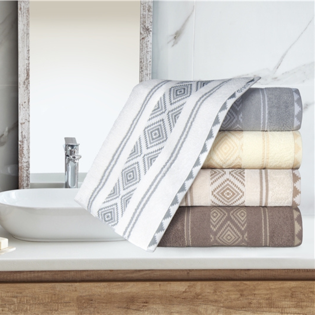 Ręcznik bawełniany Azteka został wykonany z wysokiej jakości przędzy frotte, składającej się w 100% z puszystej mikrobawełny, która zapewnia wysokie właściwości higroskopijne czyli zdolność pochłaniania wilgoci. Charakteryzuje się najbardziej optymalną do codziennego użytku gramaturą 450 g/m², dzięki której szybko schnie. Dodatkowo ręcznik Azteka cechuje się przyjemnym i miękkim chwytem z azteckim akcentem na bordiurze. Świetnie odnajdzie się w klasycznych jak i nowoczesnych wnętrzach tym bardziej, że ręcznik występuje w bogatej kolorystyce kolorów Ziemii.